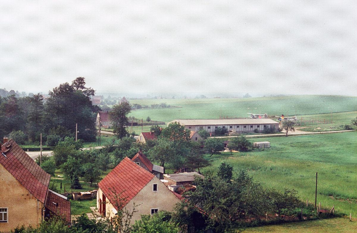 Blick vom Kirchturm, Nord-West, Ortschaft, Häuser, Gärten, Wiesen, Felder, Wirtschaftsgebäude, Flugplatz