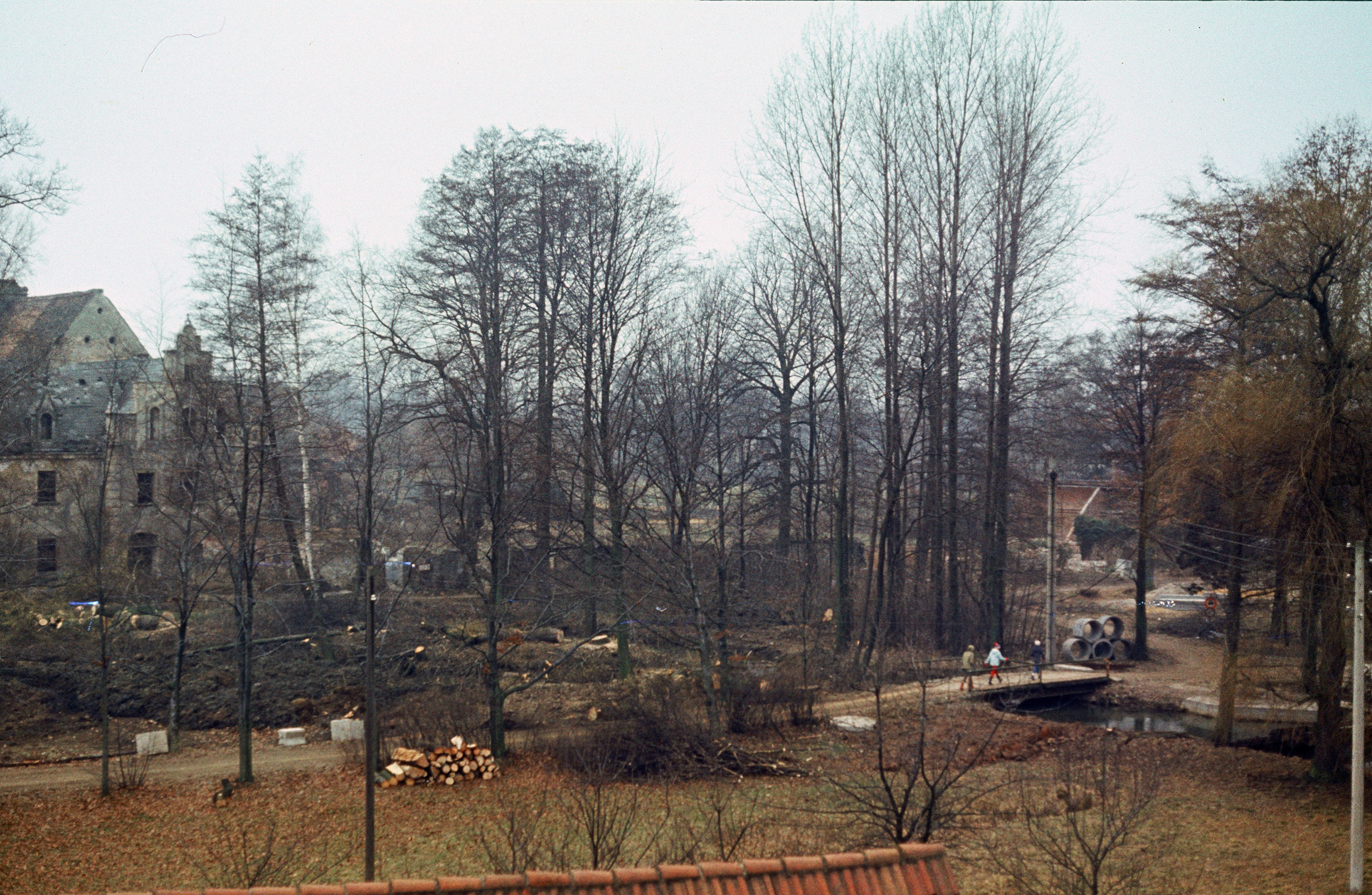 Wiese mit Obstbäumen, Fällarbeiten, Graben mit Brücke, Schloss Ullersdorf