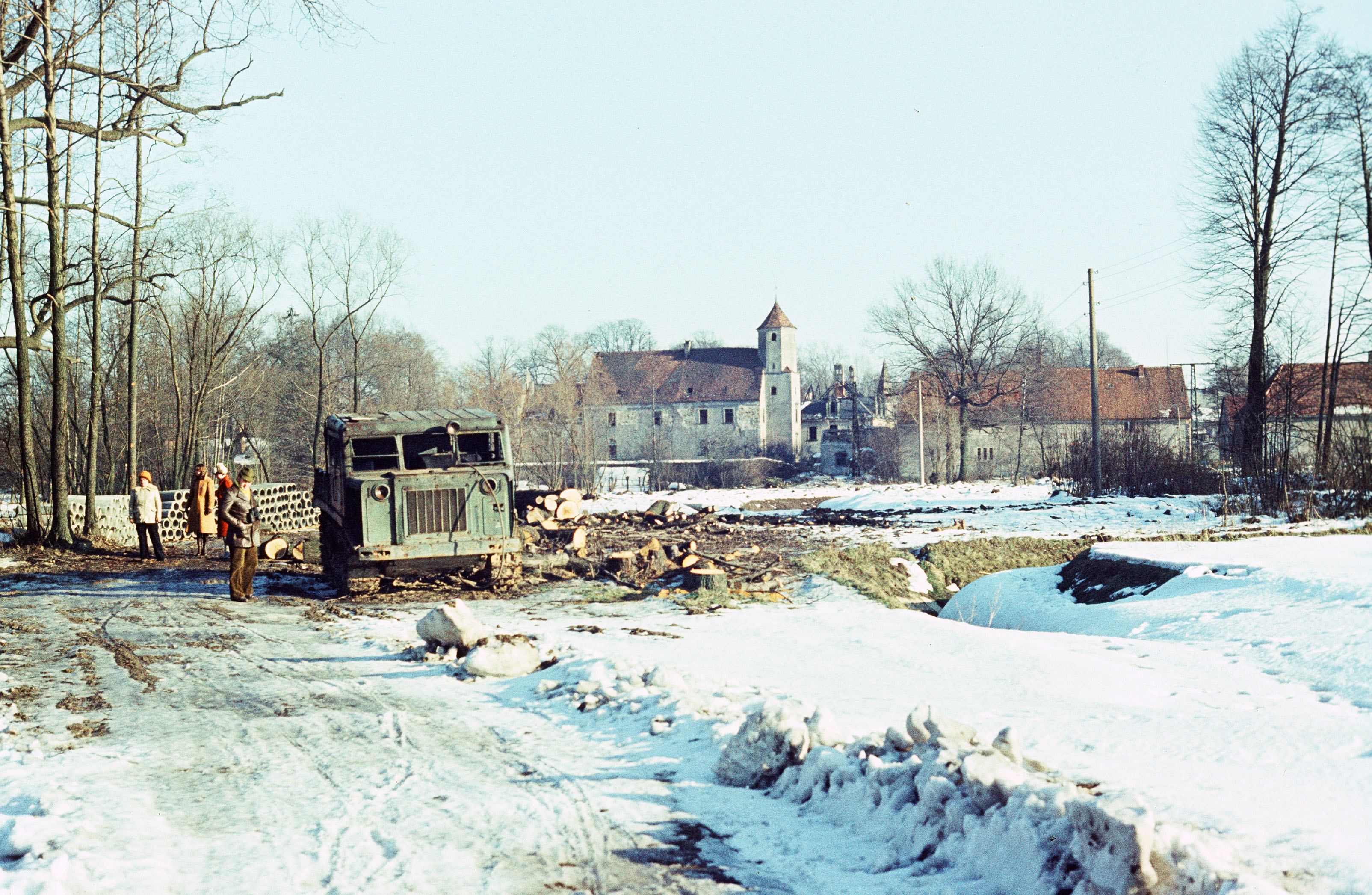 verschneite und vereiste abgeholzte Fläche, Gräben, Baufahrzeug, Ruine des Ullersdorfer Schlosses