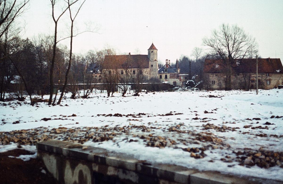verschneite, brachliegende Fläche mit Büschen, Graben, Ruine des Ullersdorfer Schlosses