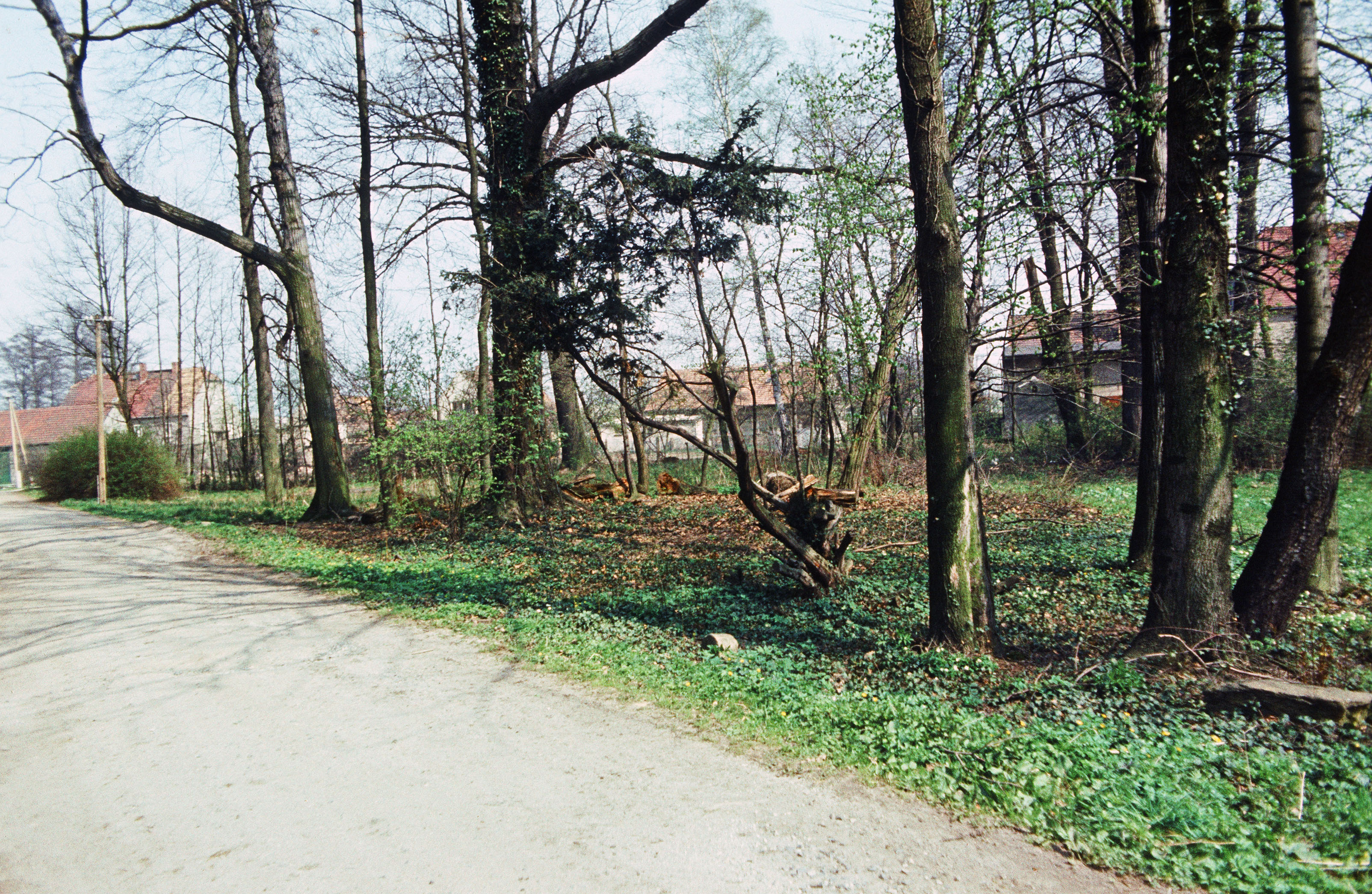 Straße neben einer mit verschiedenen Bäumen und Sträuchern bewachsenen Fläche, im Hintergrund Häuser