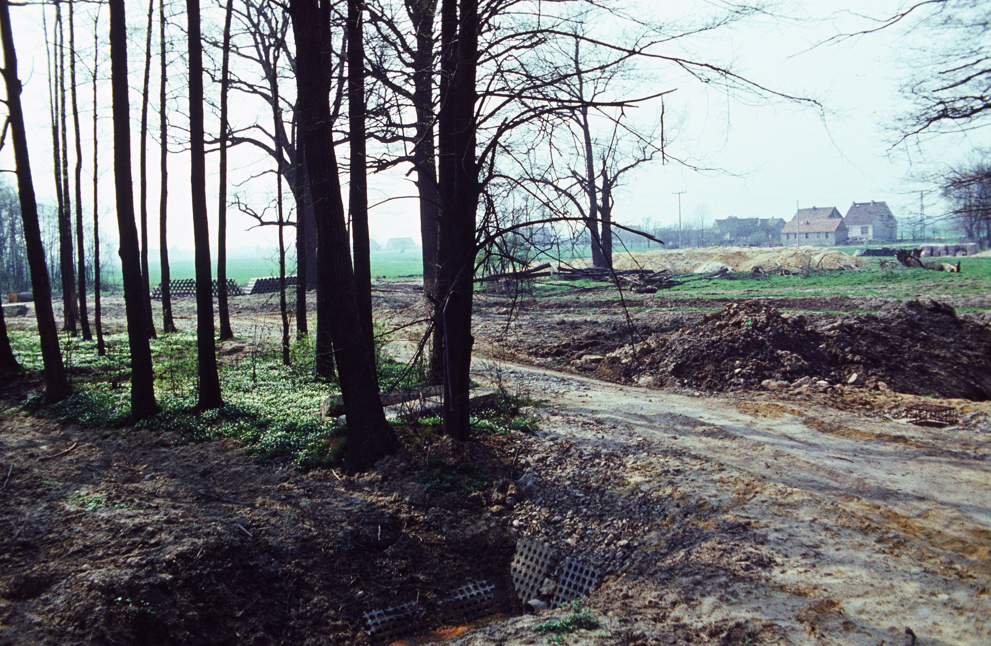Blick aus dem Park hinaus auf umliegende Felder, Graben, Frühblüher, Heuhaufen, Baumaterialen, Häuser und Feld