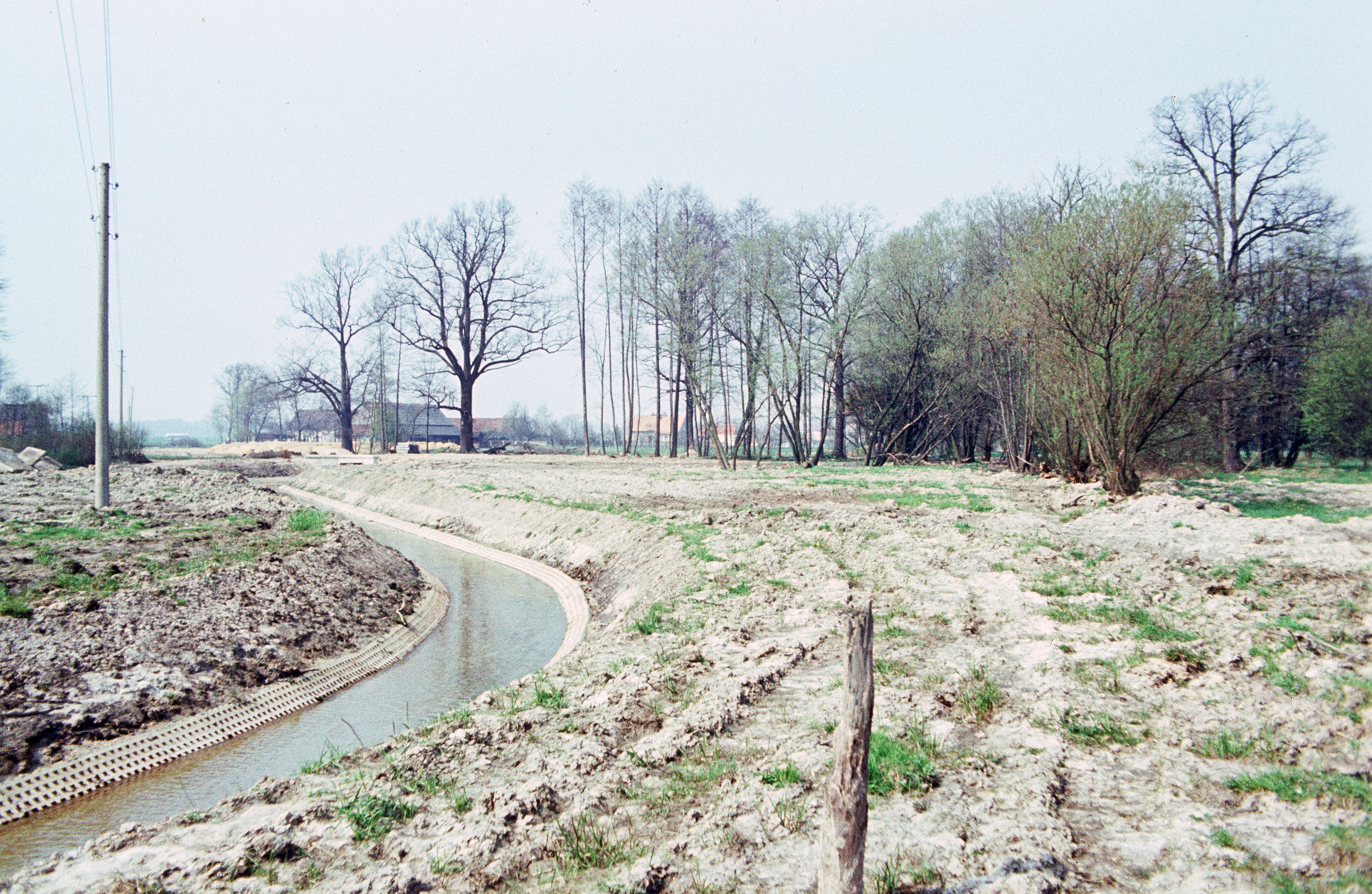 Neu angelegter, befestigter Graben zwischen Brachflächen, Bäume und Sträucher, Häuser