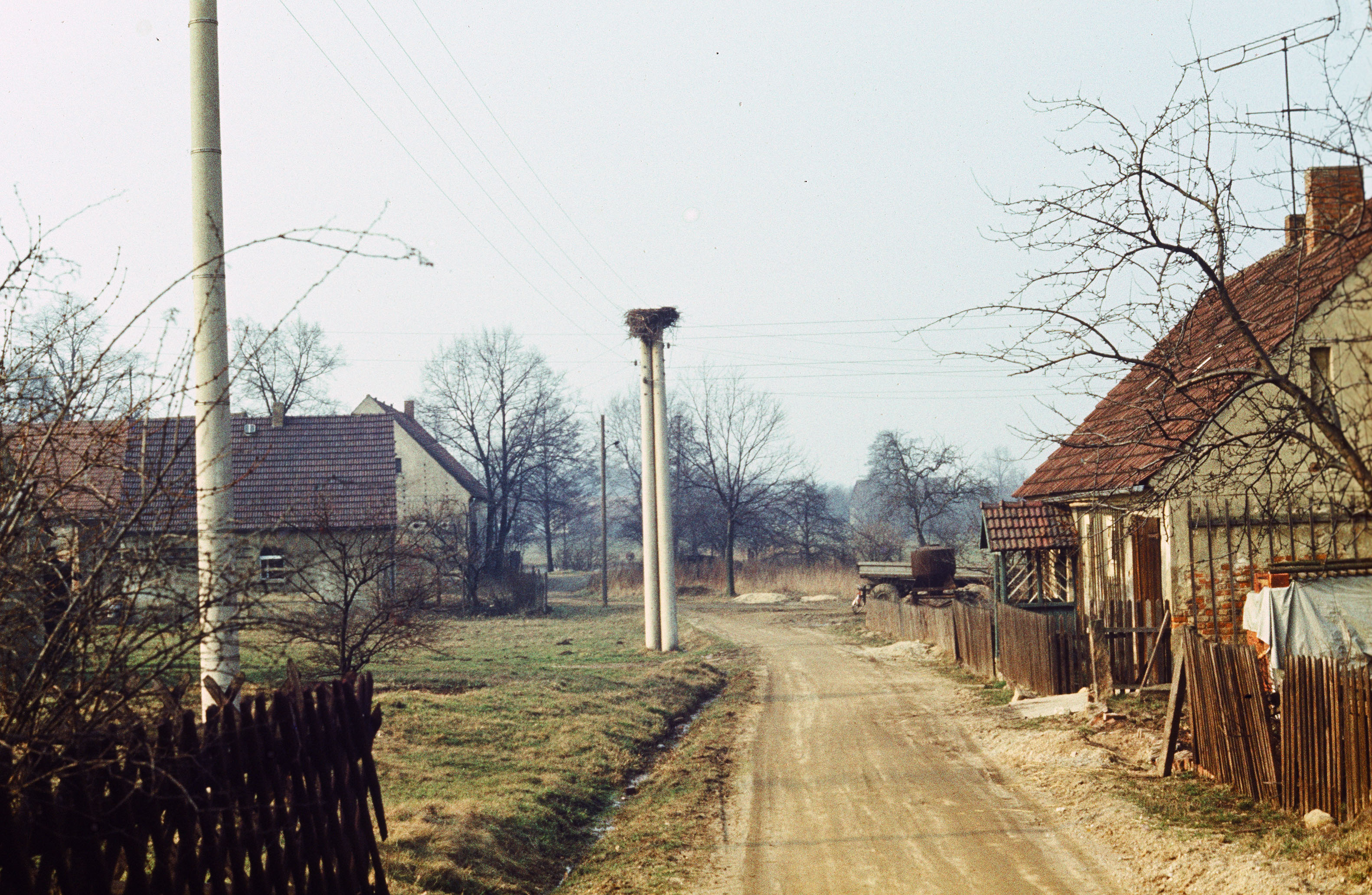 Unbefestigte Dorfstraße, Häuser, Strommasten, Storchennest, Graben