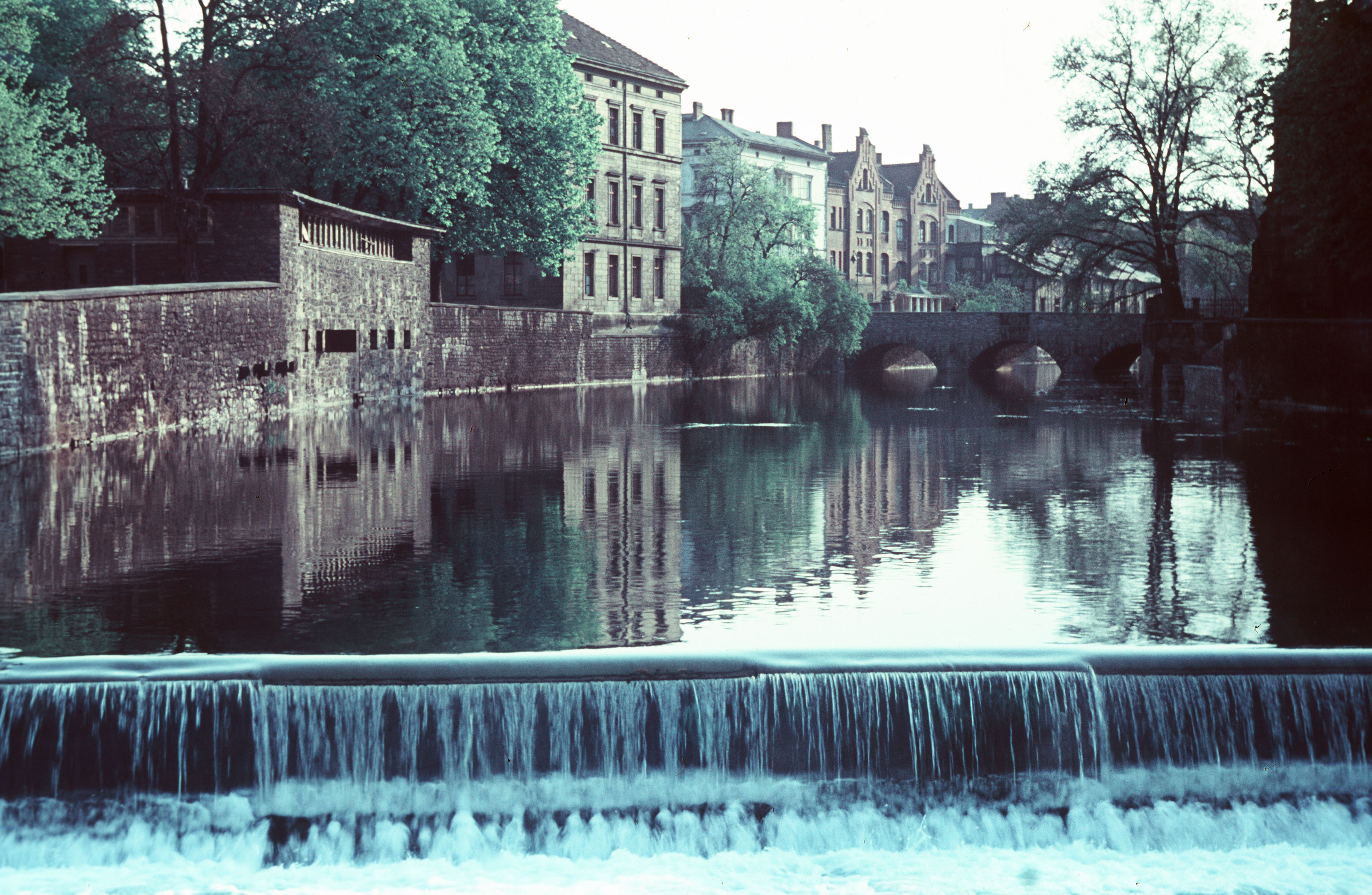Erfurt, Blick über die Gera, Wasserstufe, Ufer berenzt durch Wohnhäuser, Brücke