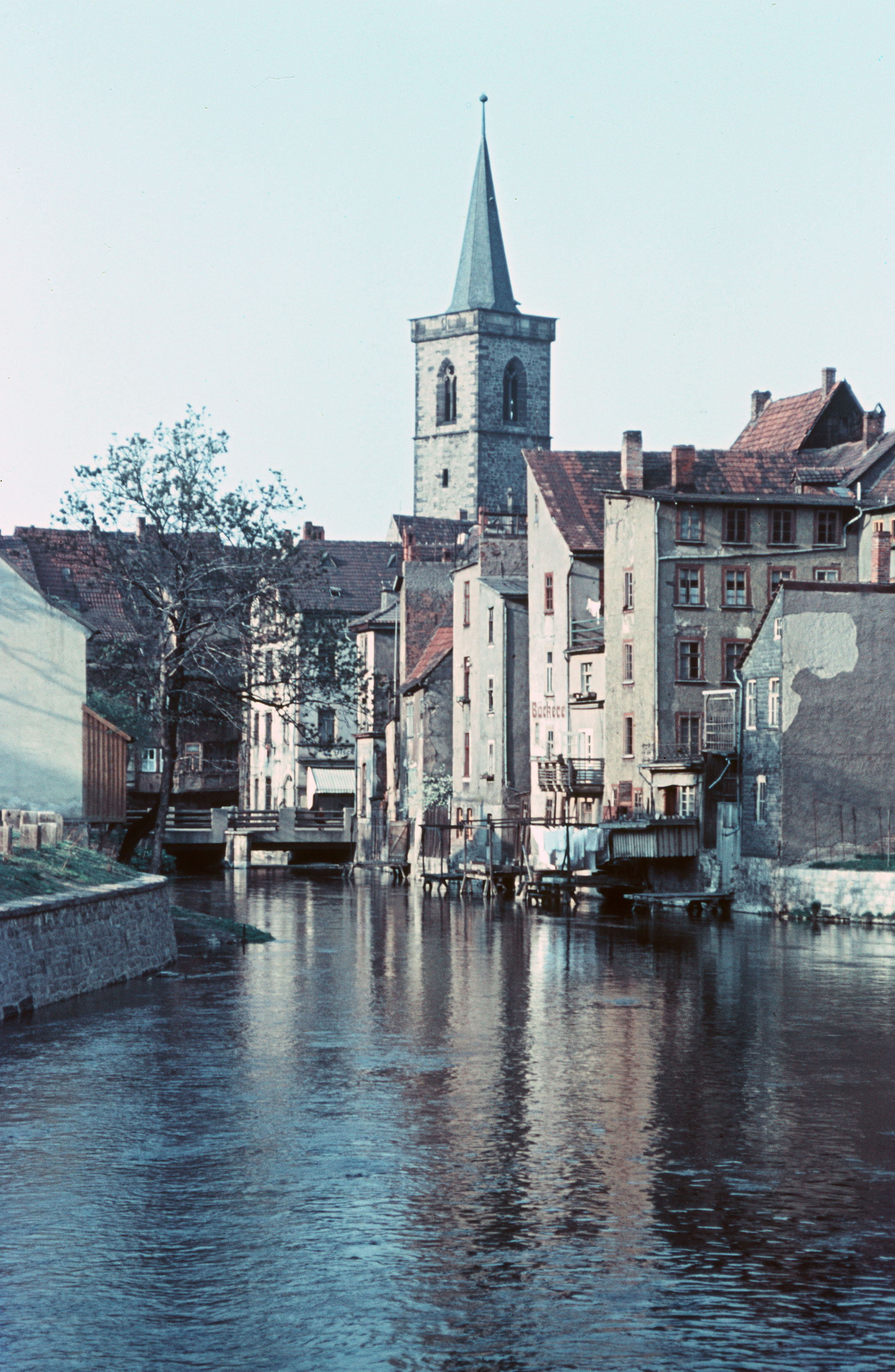 Erfurt, Blick über die Gera, seitliches Ufer befestigt, rechts begrenzt durch Wohnhäuser, Turm der Aegidienkirche