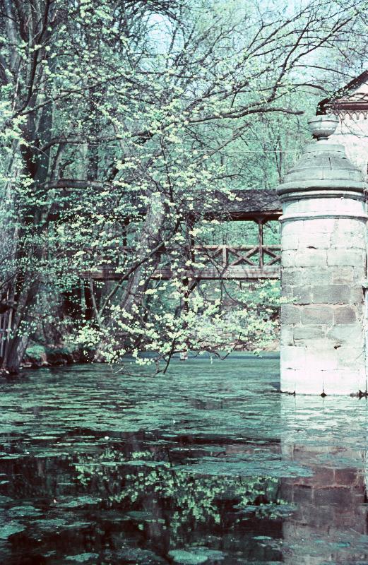 Wassergraben ums Schloss Kochberg über den eine Brücke führt, Ufer natürlich bewachsen