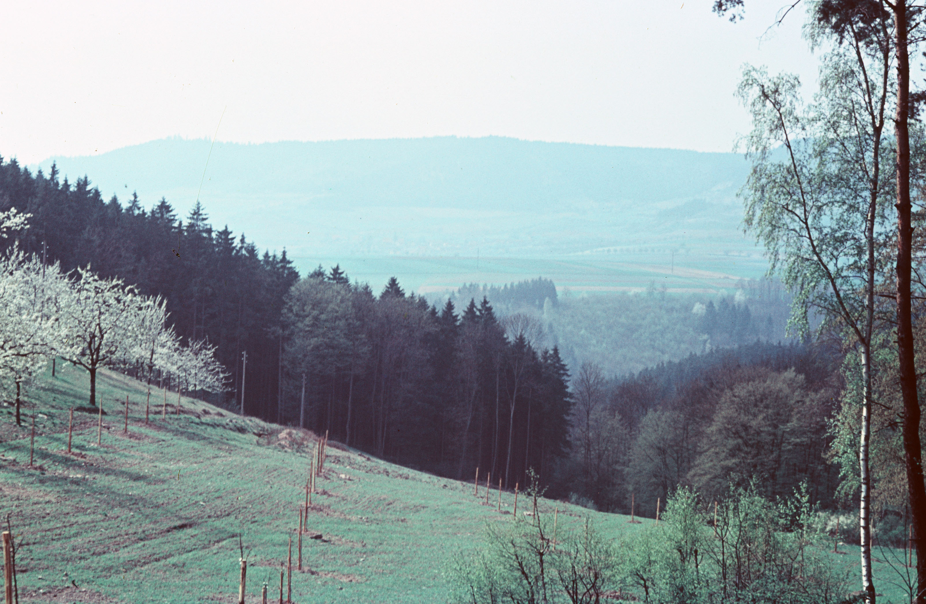 Mittelgebirgslandschaft, Obstbaumplantage, Mischwald, Nadelwald, Hintergrund: Feld