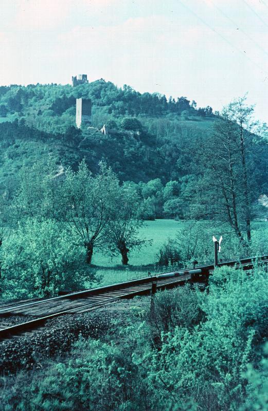 Gleise, Wiese, Burgruine auf Hügel