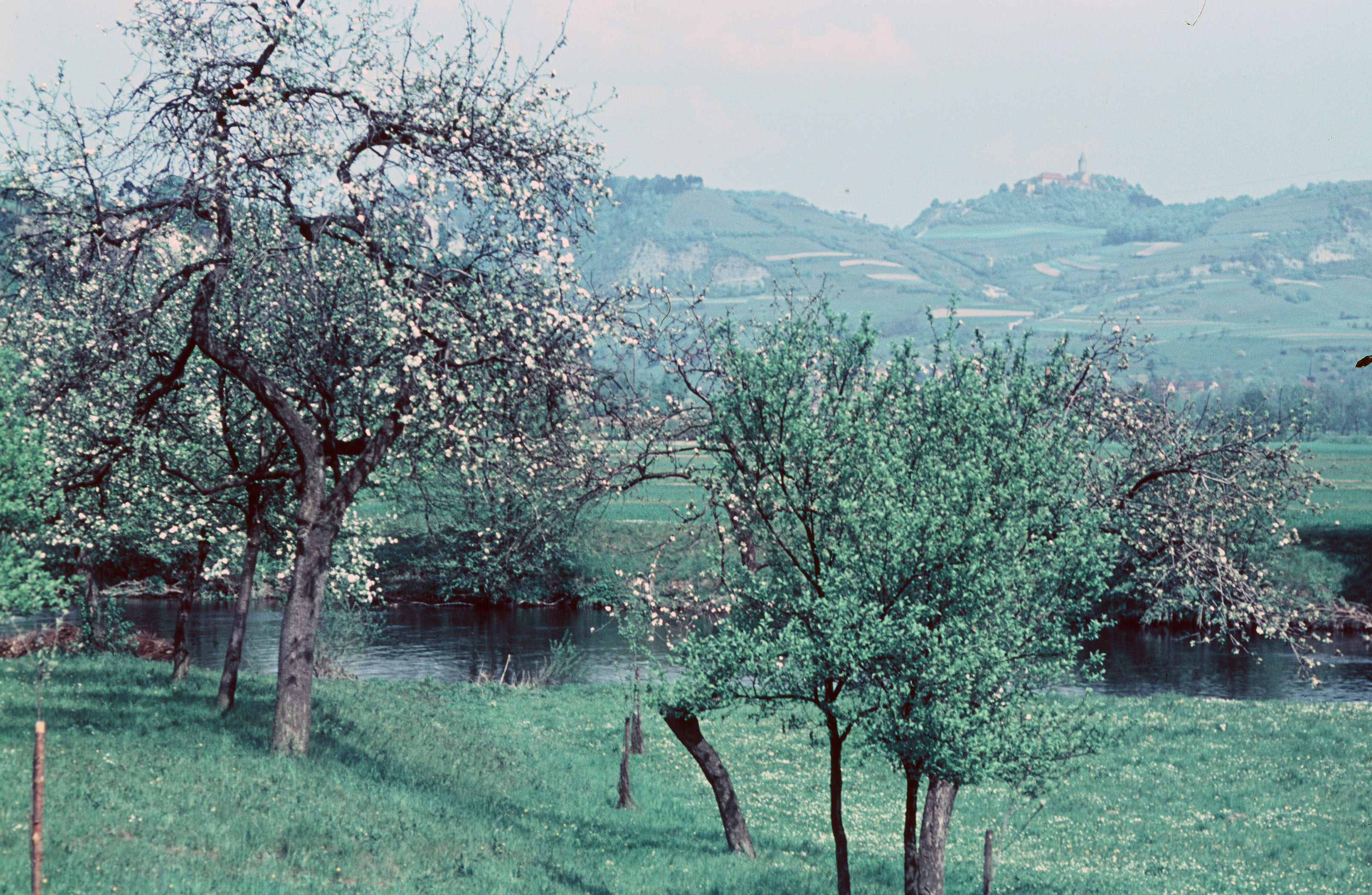Fluss durch Obstbaumplantage, Hintergrund: Weinberge bei Kahla, Leuchtenburg