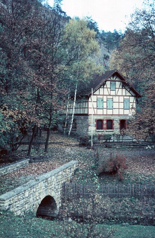 Fachwerkhaus mit Garten am Fuß eines bewaldeten Berges, Brücke über Bachlauf