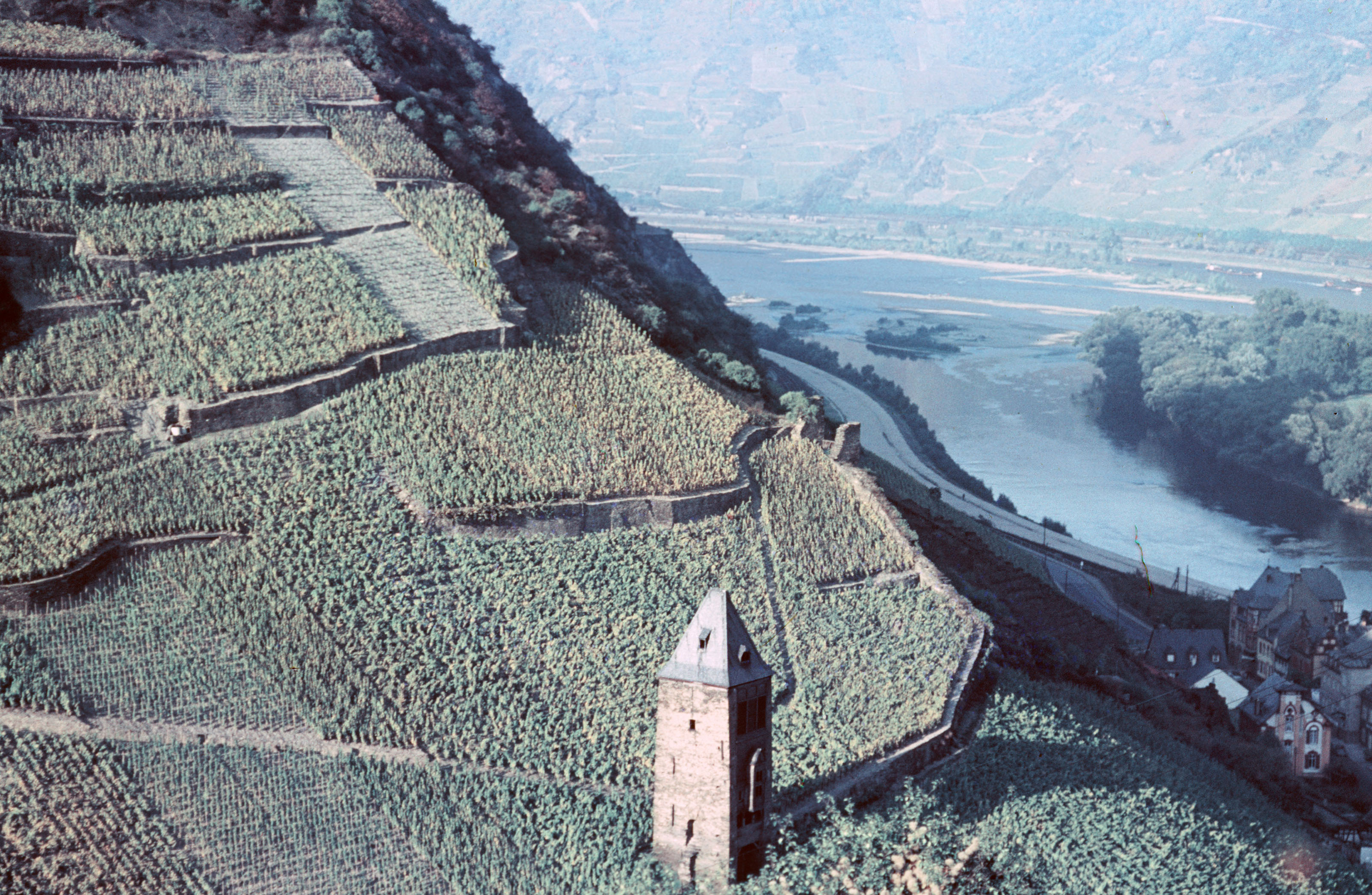 Blick auf Weinberge, Postenturm, Rhein, Weinberge
