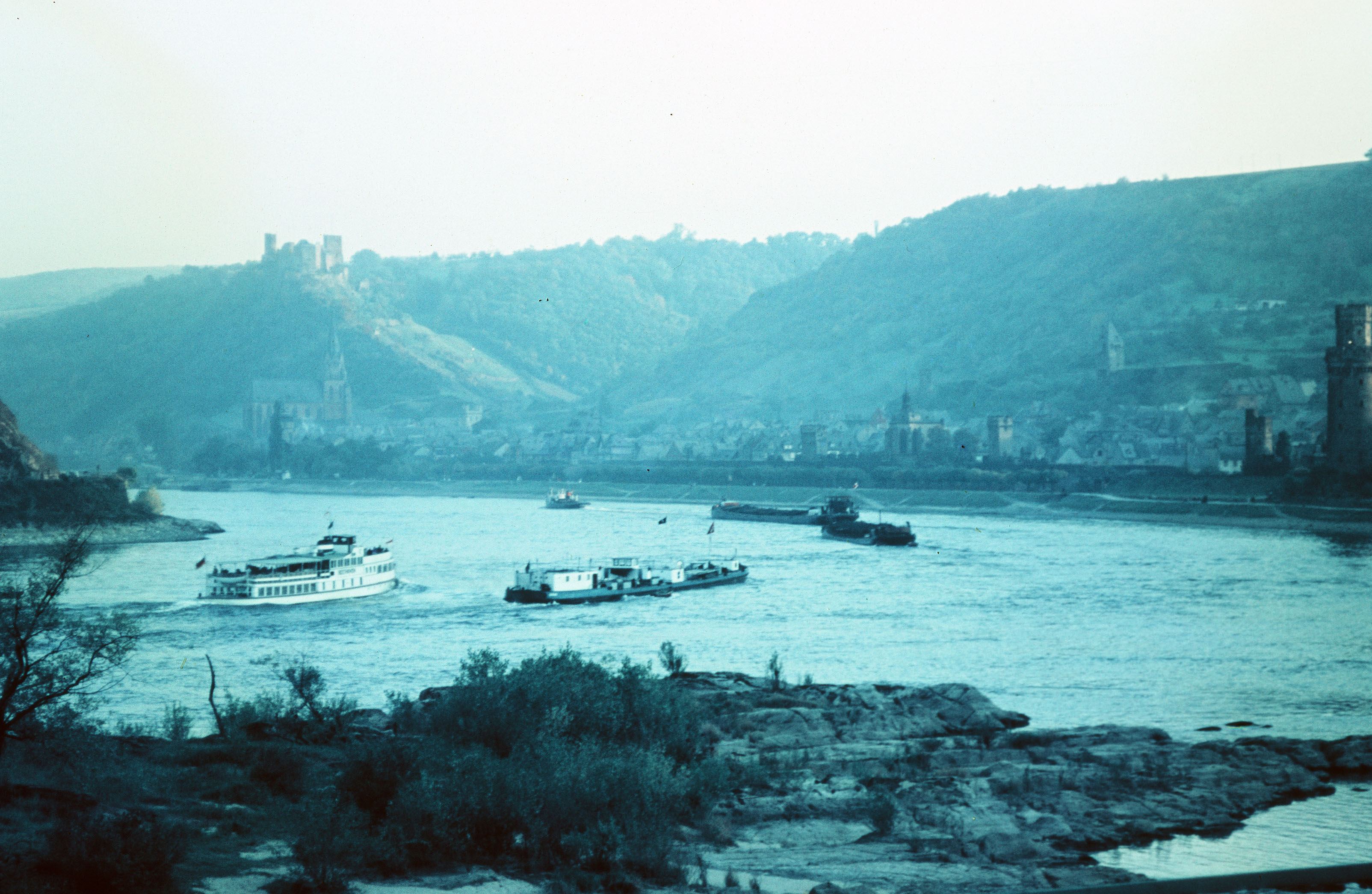 Blick über den Rhein auf Oberwesel und dahinterliegende Berge