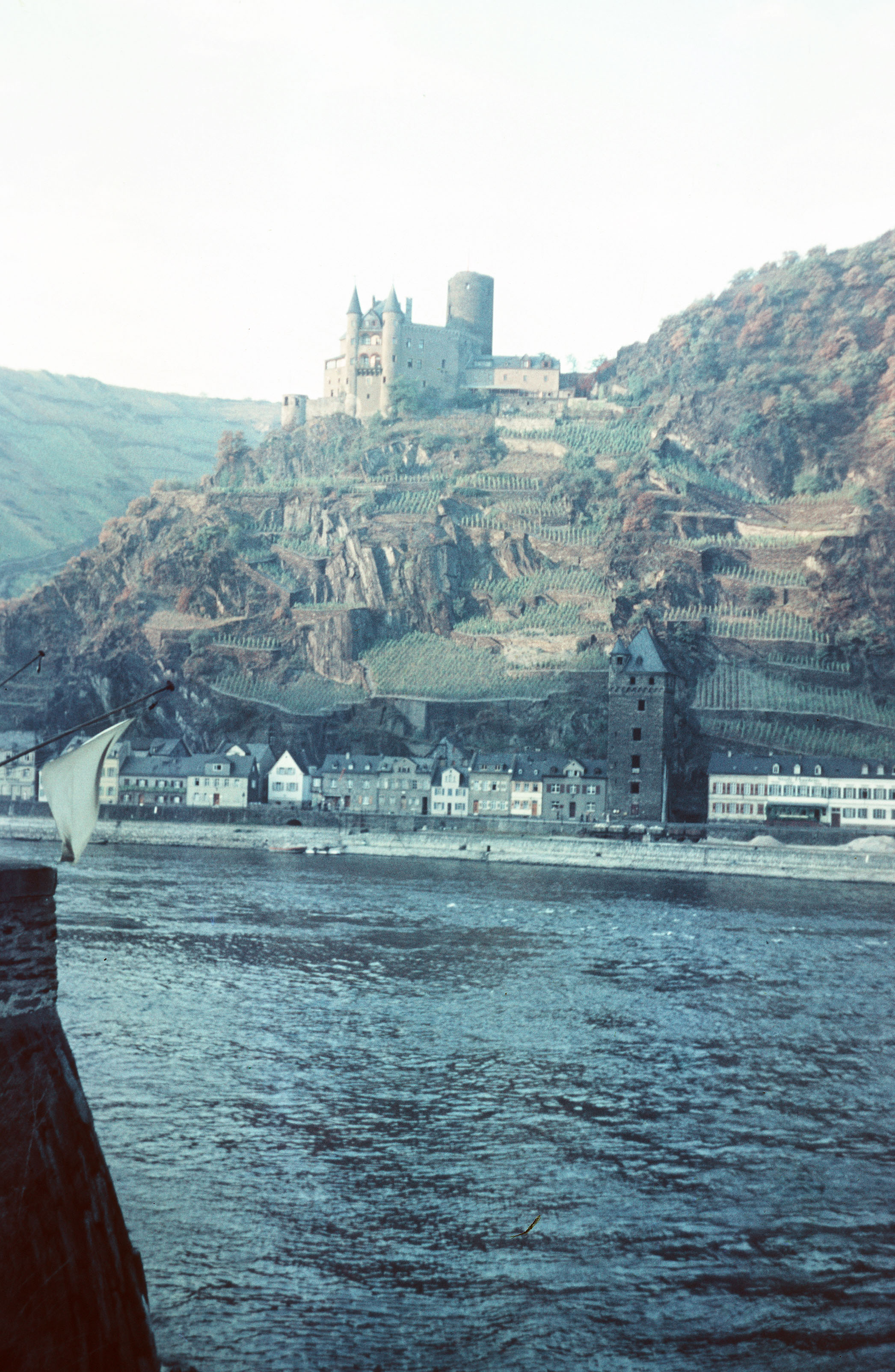 Blick über Rhein auf Rheinhänge, St. Goar und Burg Katz
