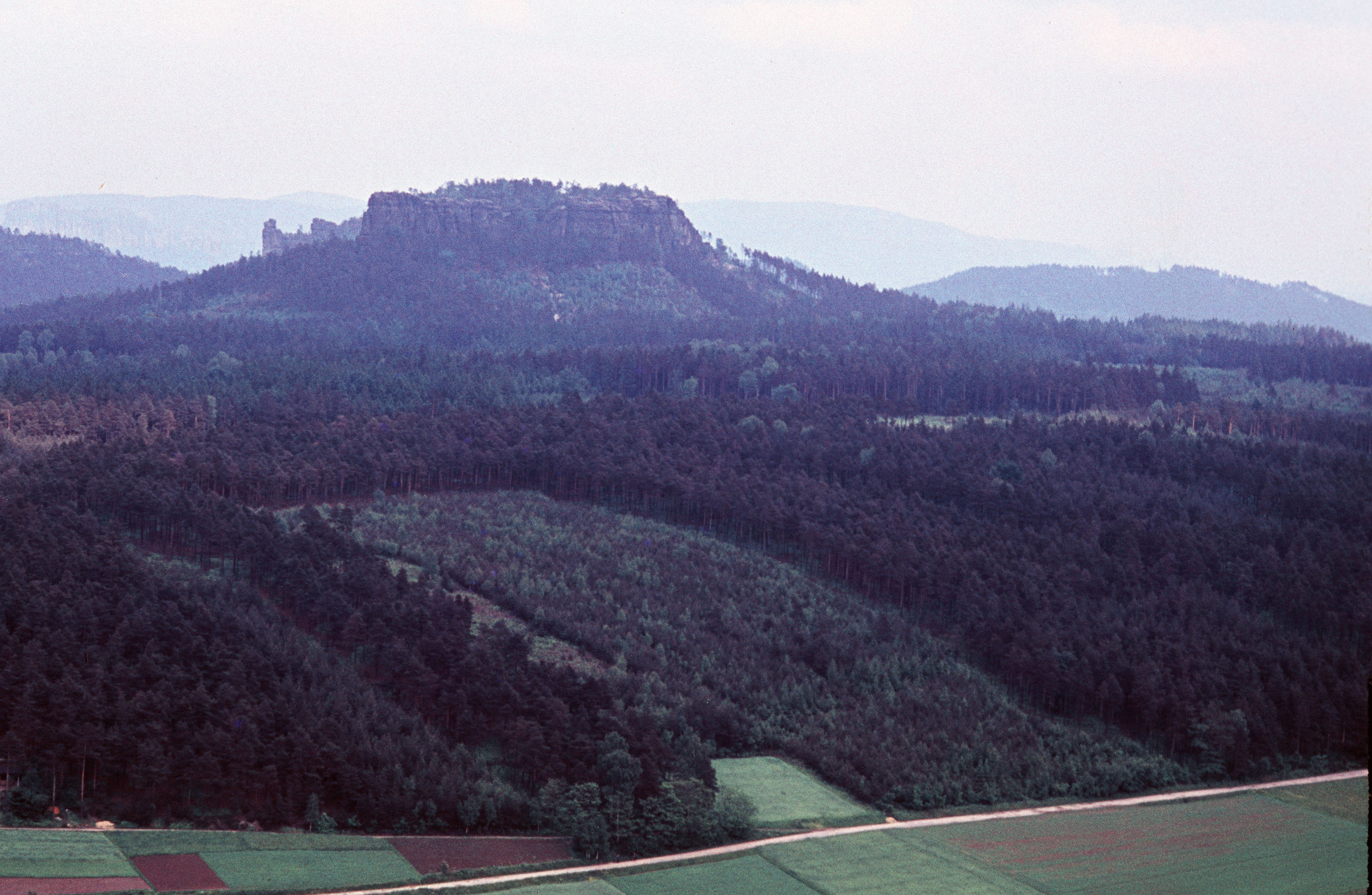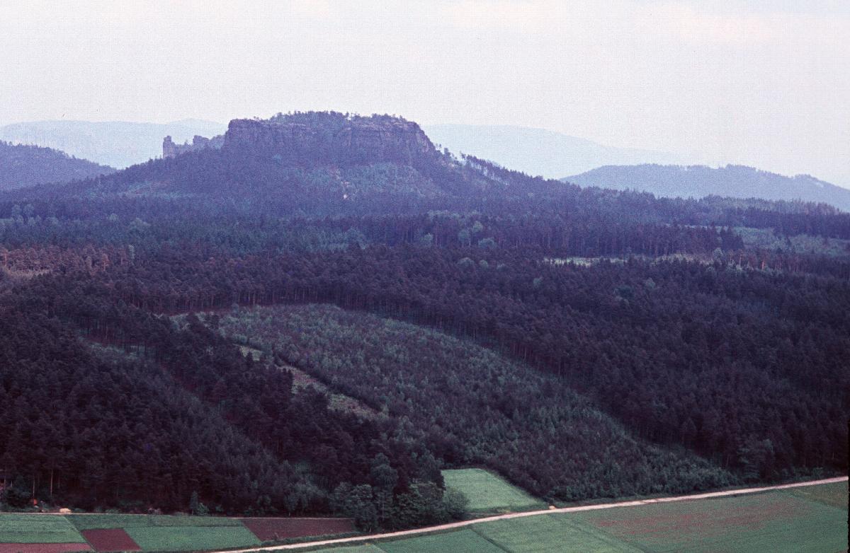 Blick auf Gorisch und Papststein vom Pfaffenstein vermutlich von der Aussicht an der Barbarine