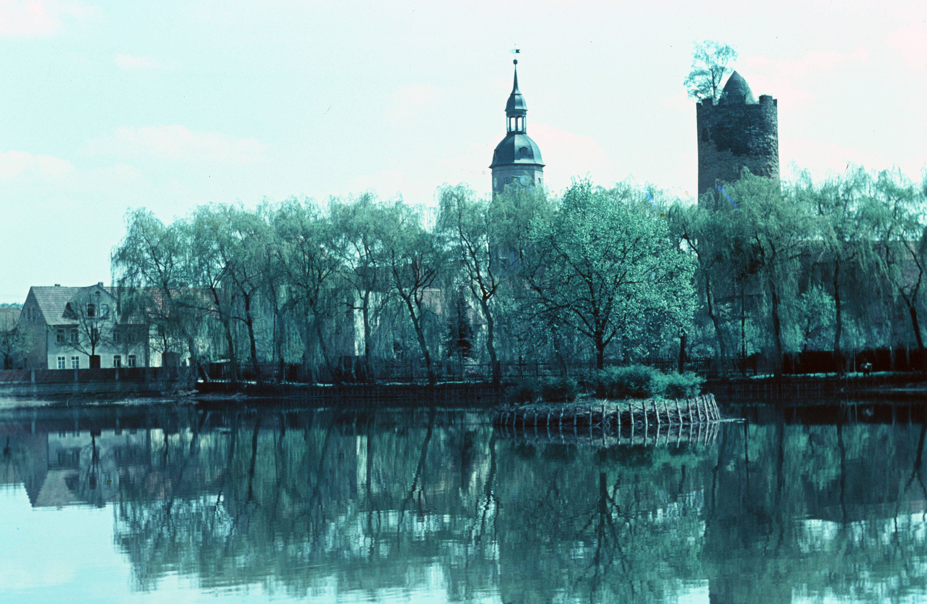 Stadtteich Triptis mit Blick auf Kirchturm und Schlossturm