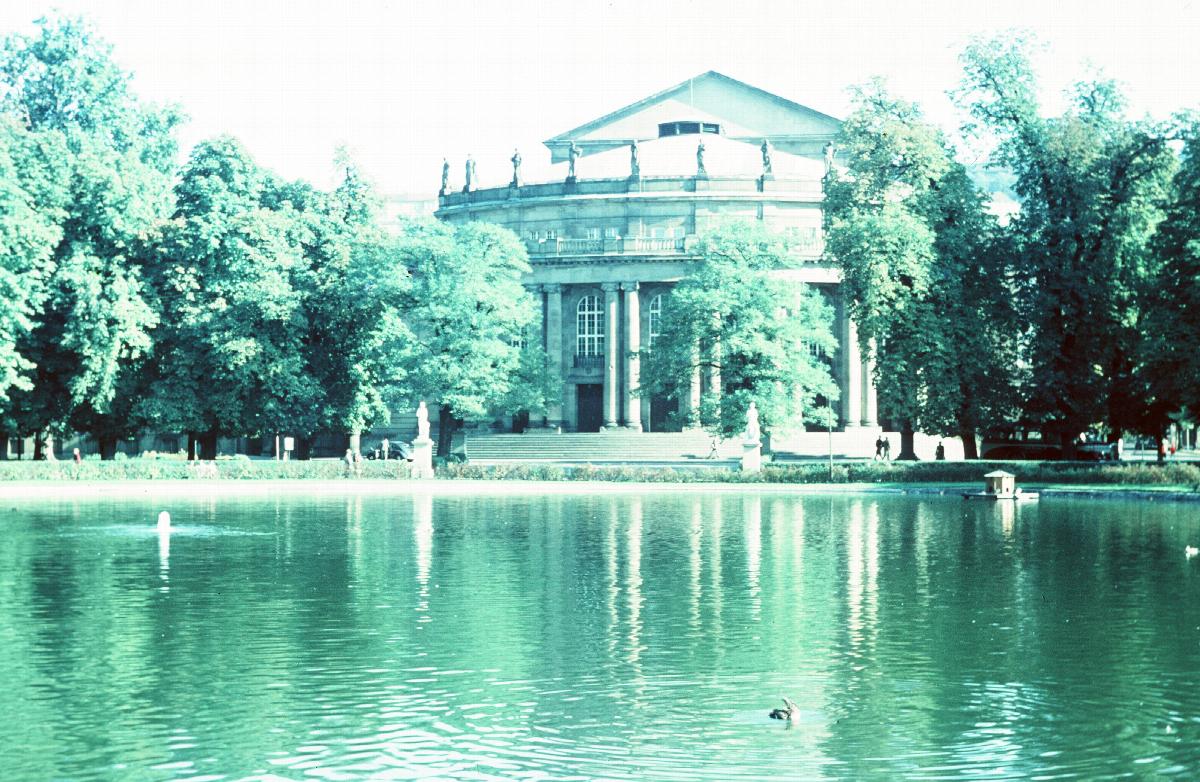 Blick über den Eckensee im Schlossgarten auf das Staatstheater