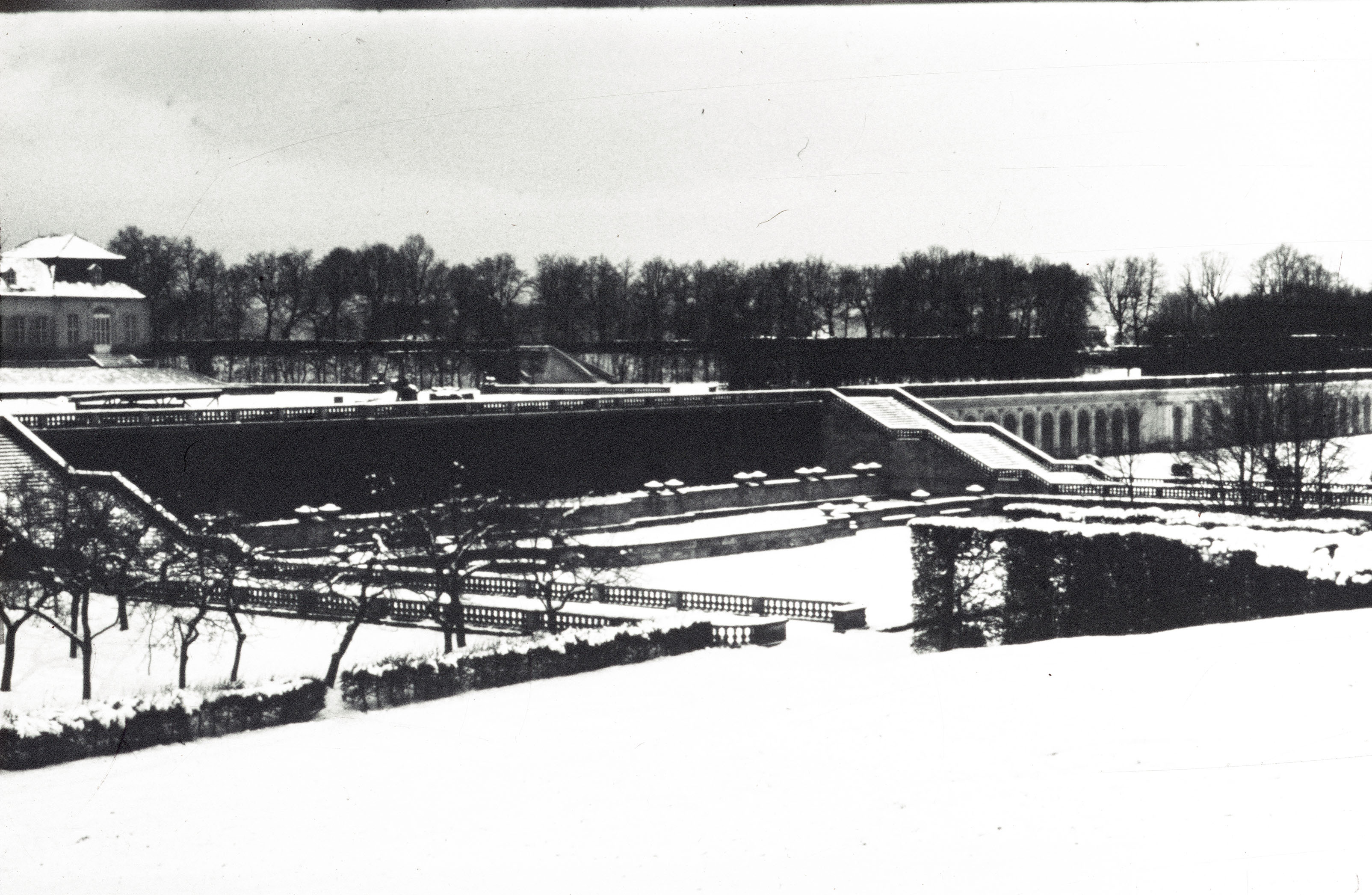 verschneite Gartenanlage des Barockgartens Schloss Großsedlitz