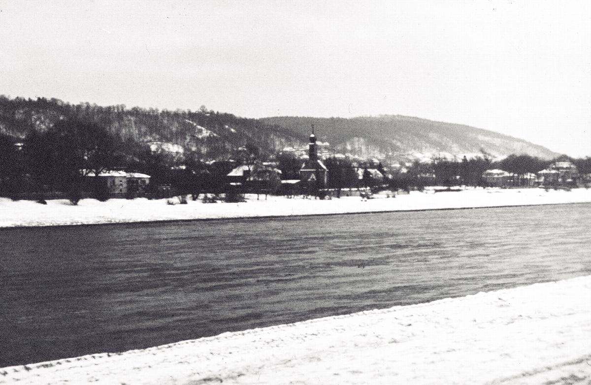 Blick über Elbe auf den Verschneiten Ortsteil "Hosterwitz" - Dresden