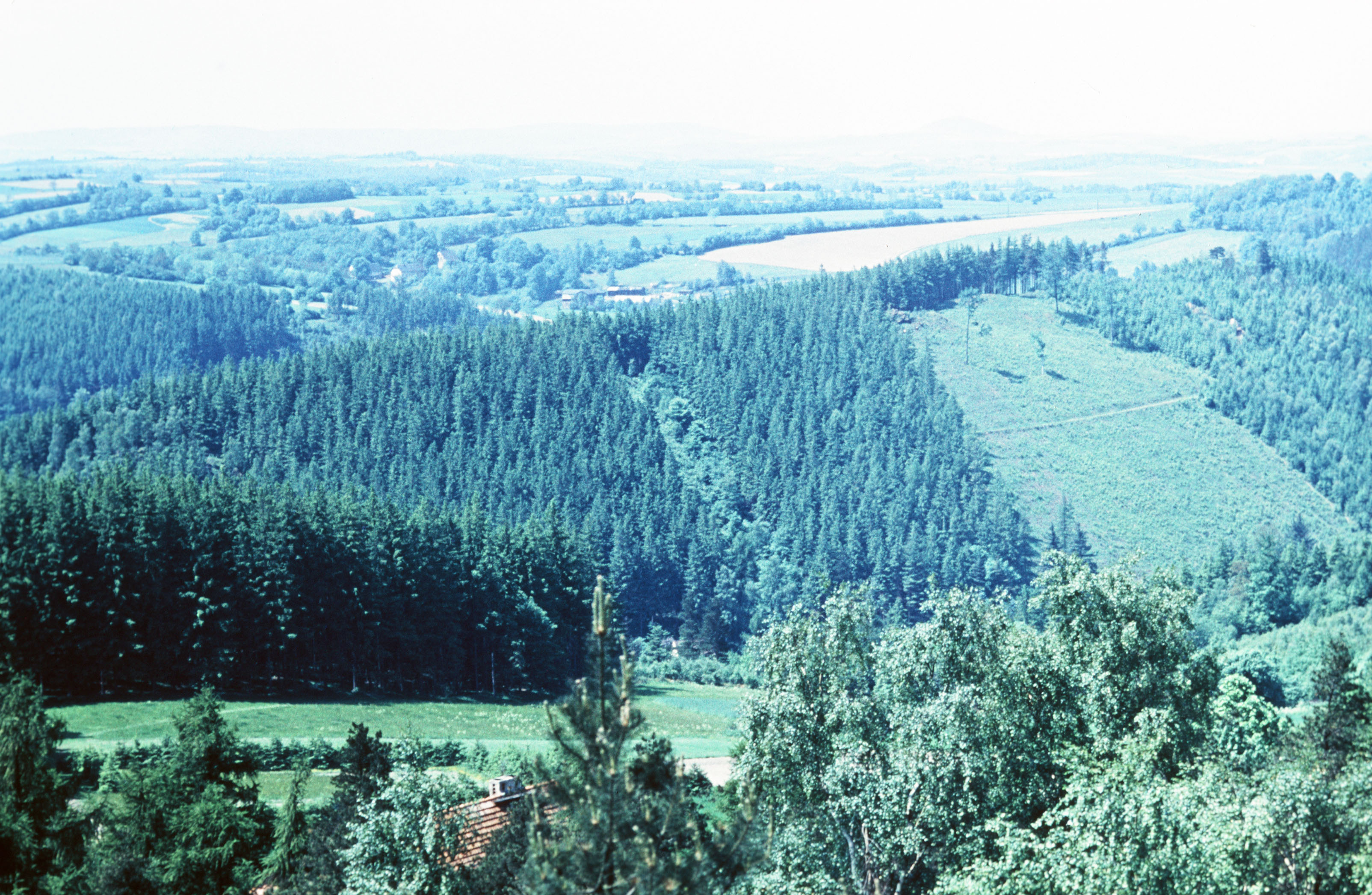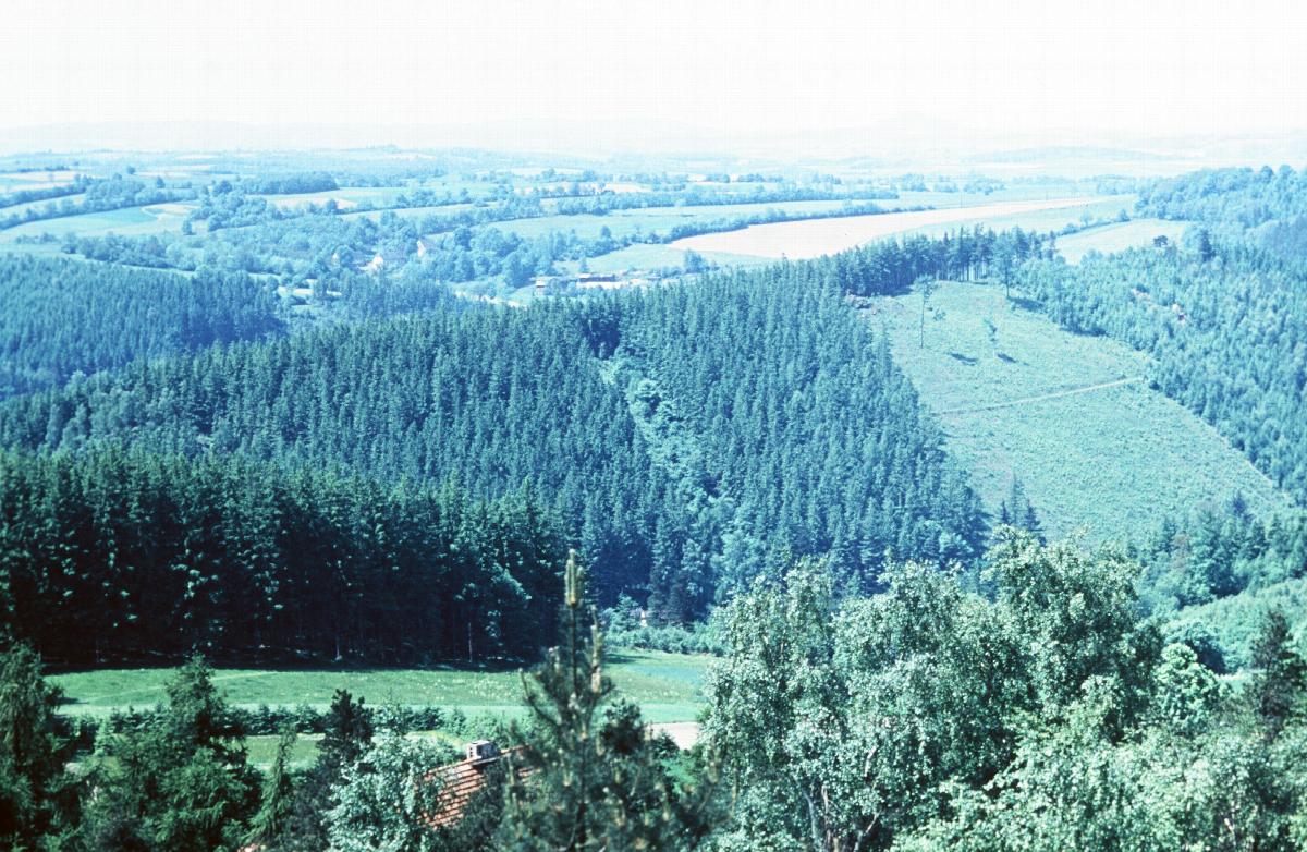 Blick über hügelreiche Landschaft mit Wäldern und Feldern