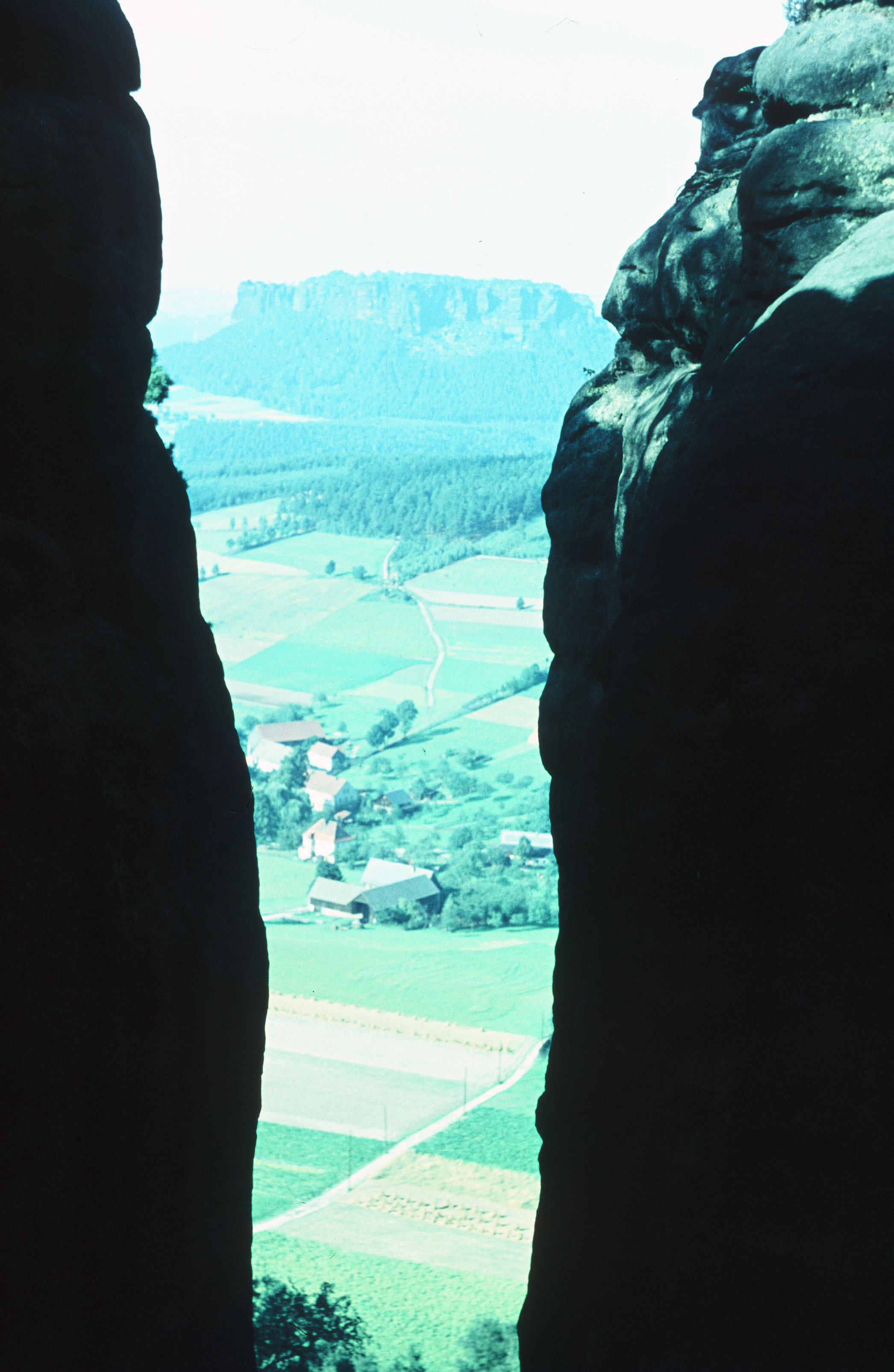 Blick durchs Nadelöhr (Pfaffenstein) auf den Tafelberg Lilienstein