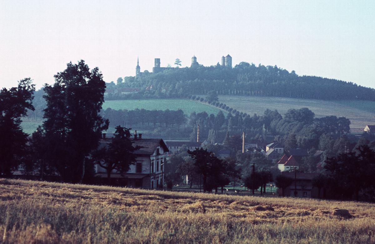 Blick über Felder und Ortschaft auf Burg Stolpen