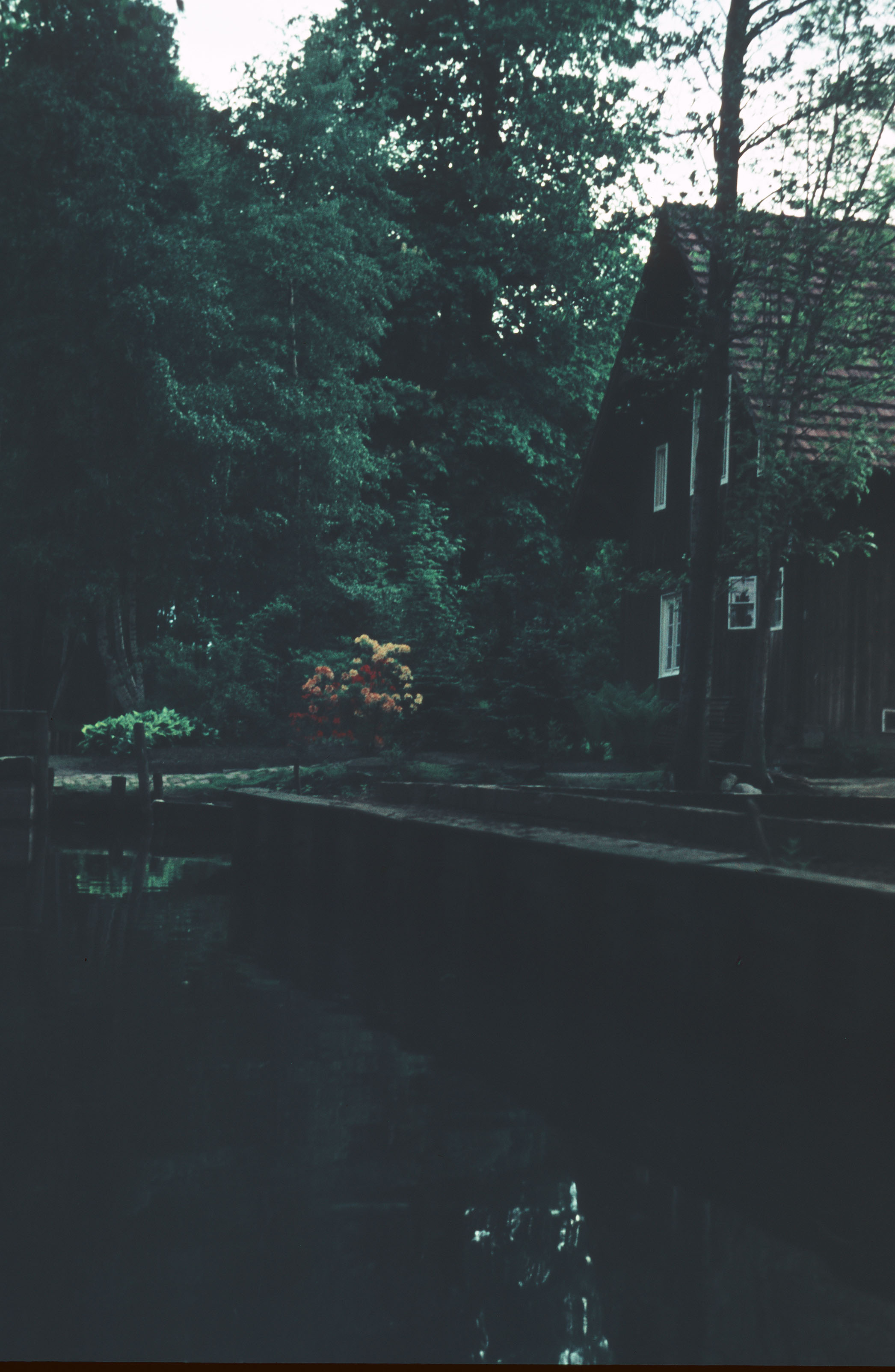 Blick vom Kanal auf kleines Häuschen am Ufer