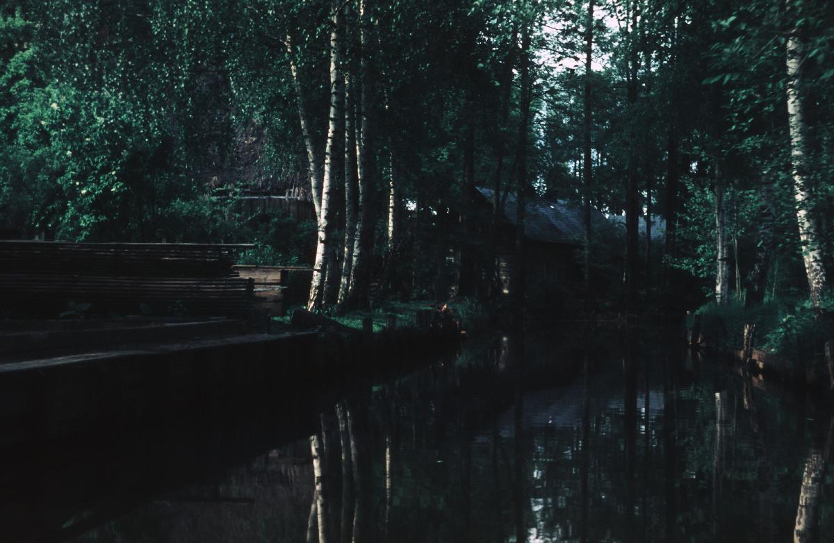 Blick vom Kanal auf kleines Häuschen am bewaldeten Ufer