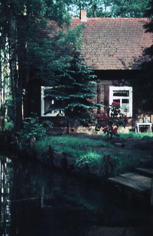 Blick vom Kanal auf kleines Häuschen am Ufer