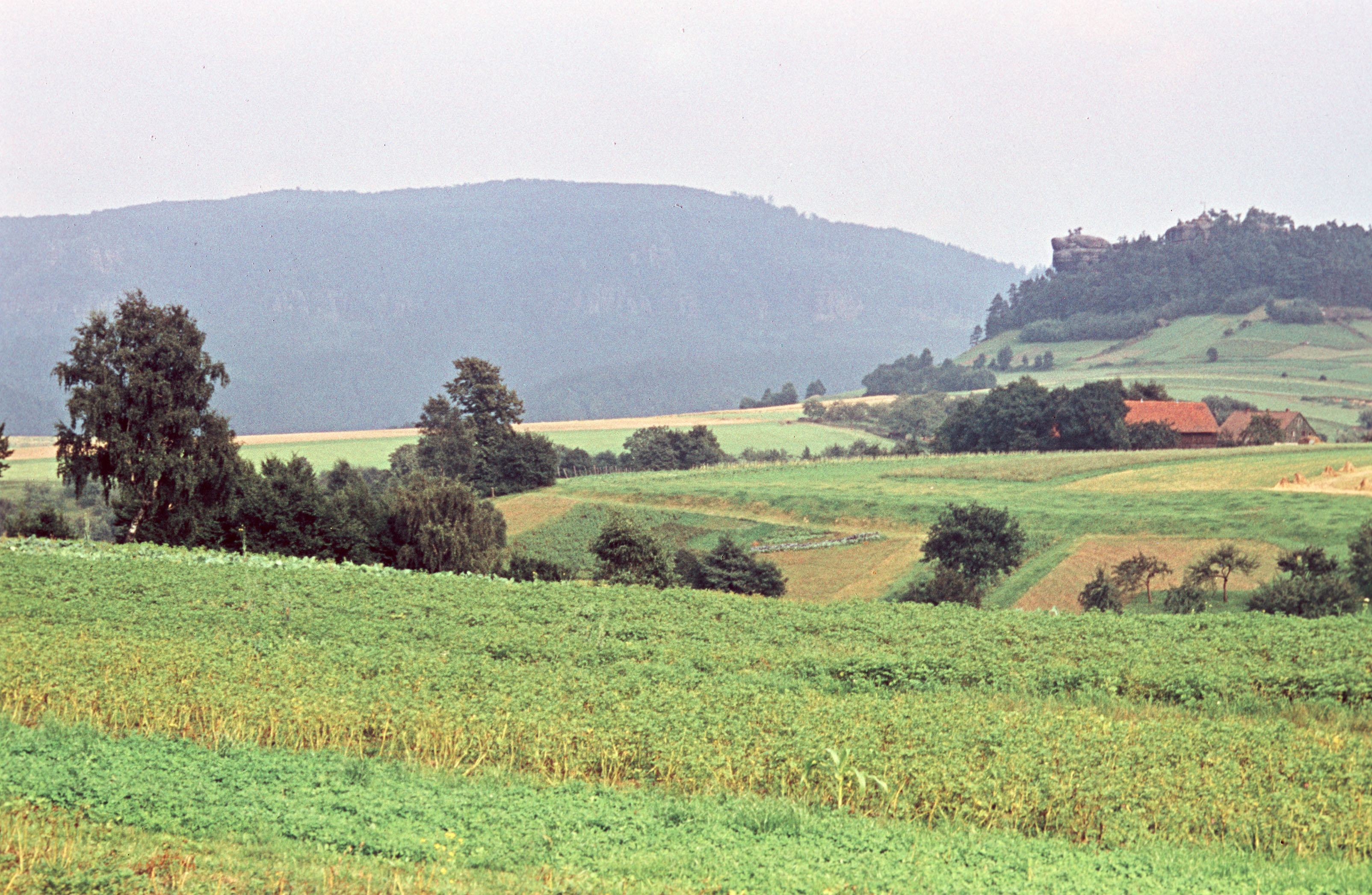 Blick über Felder und Ortschaft auf dahinterliegendes Sandsteingebirge