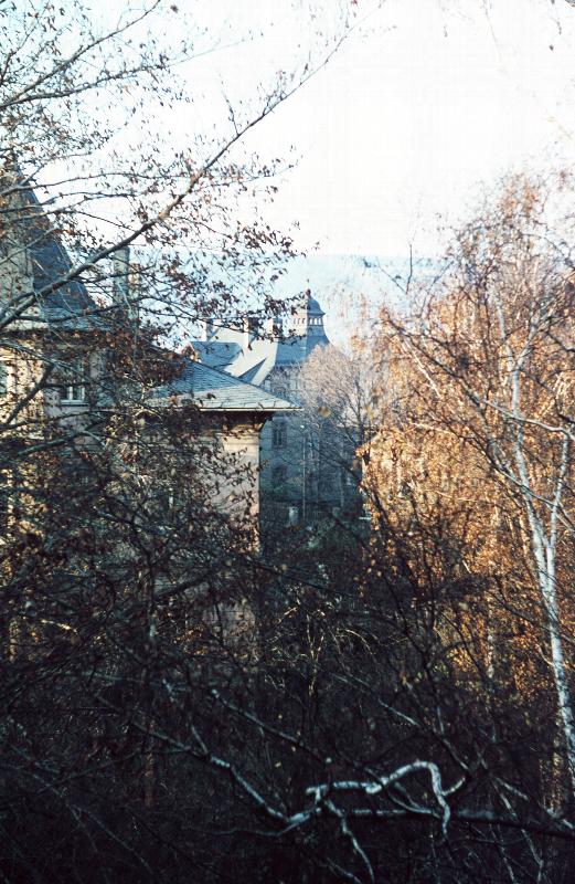 Blick durch Baumkronen auf Hausdächer einer Ortschaft