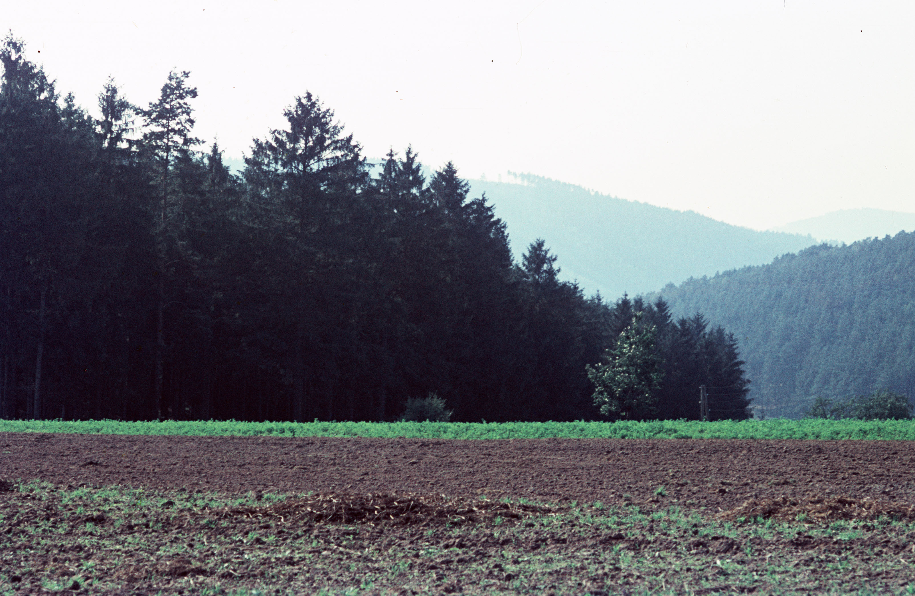 Feld vor bergiger Waldlandschaft bei Kahla