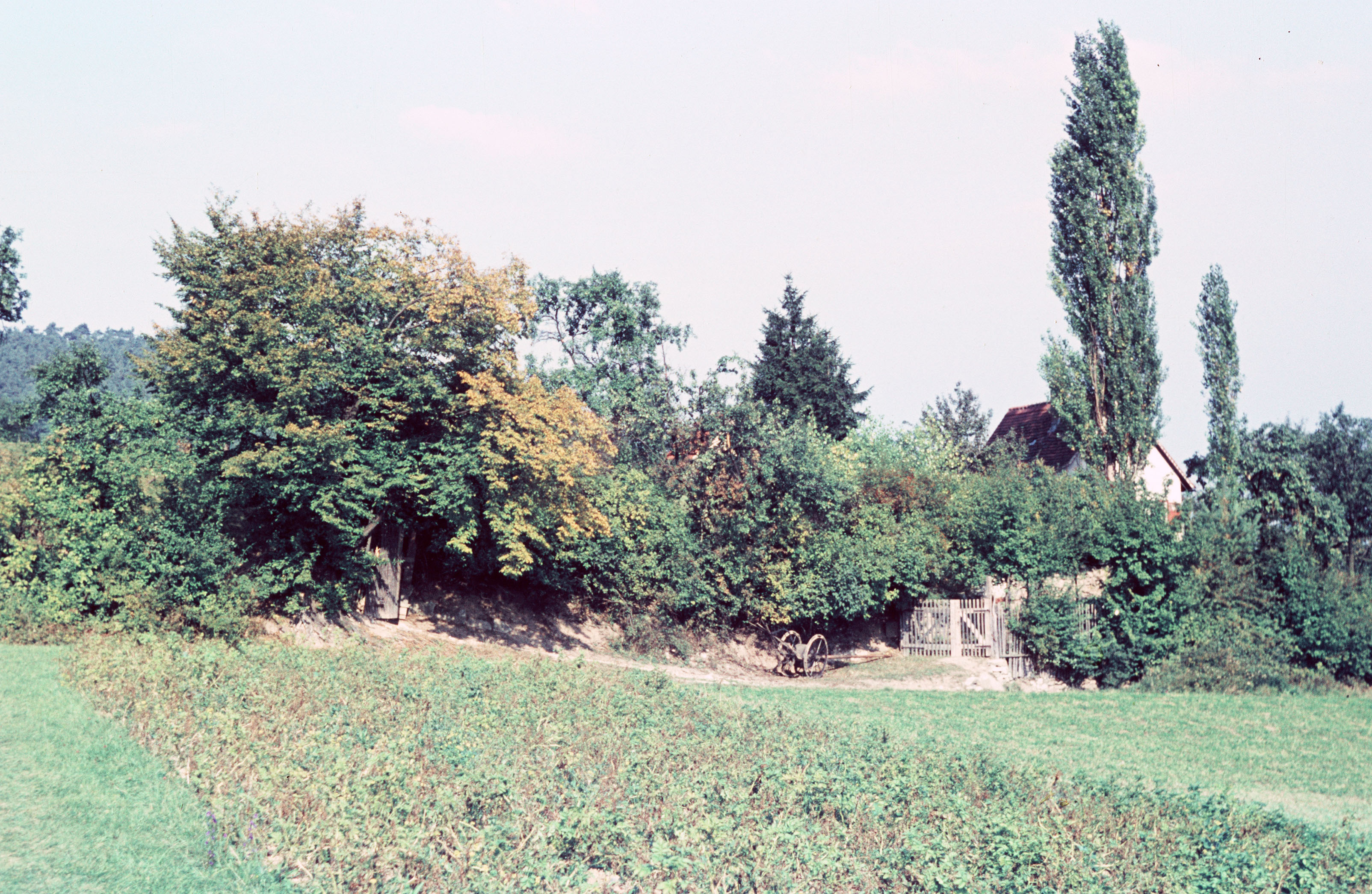 Wiesen und Feld vor mit Hecke umschlossenen Grundstück mit Haus