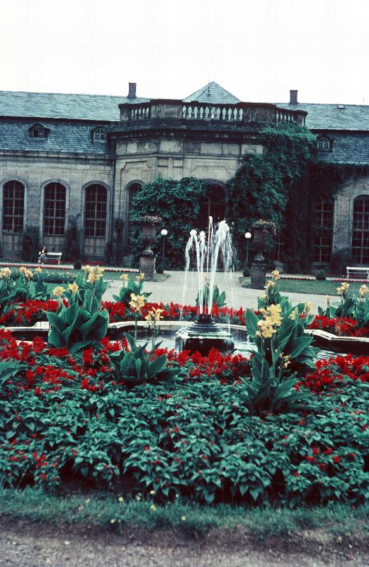 Springbrunnen und Blumenbepflanzung vor der Orangerie Gotha