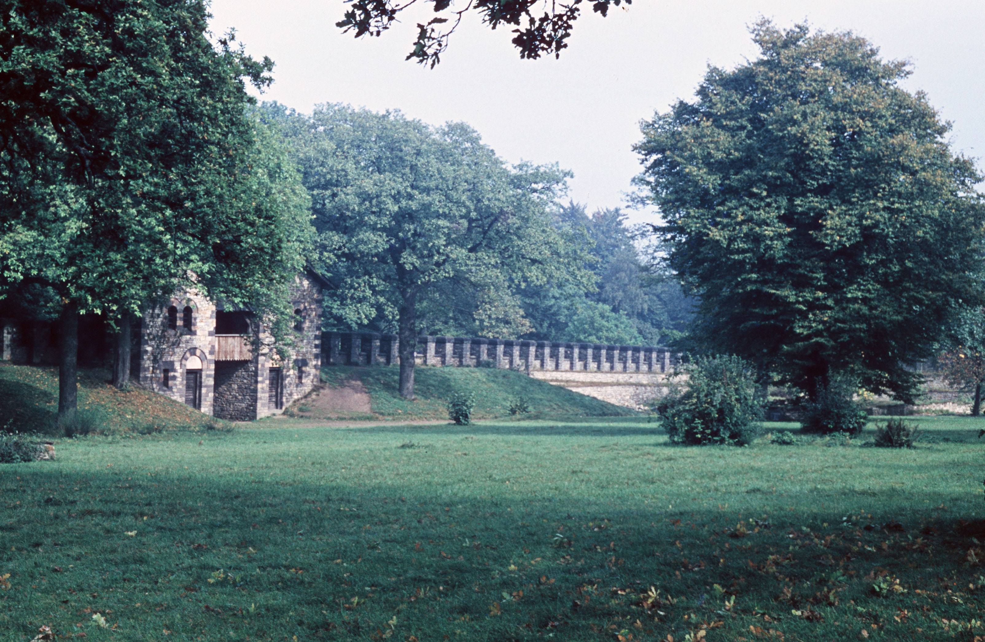 Park im Römerkastell Saalburg mit Blick auf Mauer und Tor