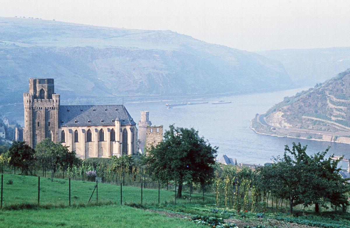 Blick über Gärten auf Pfarrkirche St. Martin, Rhein und Rheinhänge