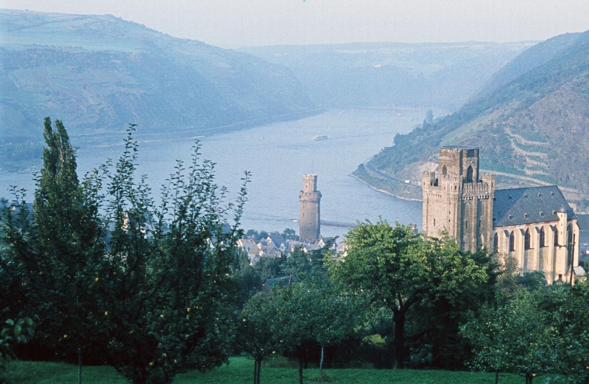 Blick über Gärten auf Pfarrkirche St. Martin, Rhein und Rheinhänge