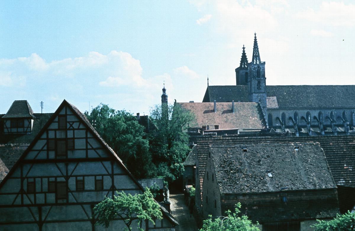 Blick von der Stadtmauer auf Kirche St. Jakob in Rothenburg ob der Tauber