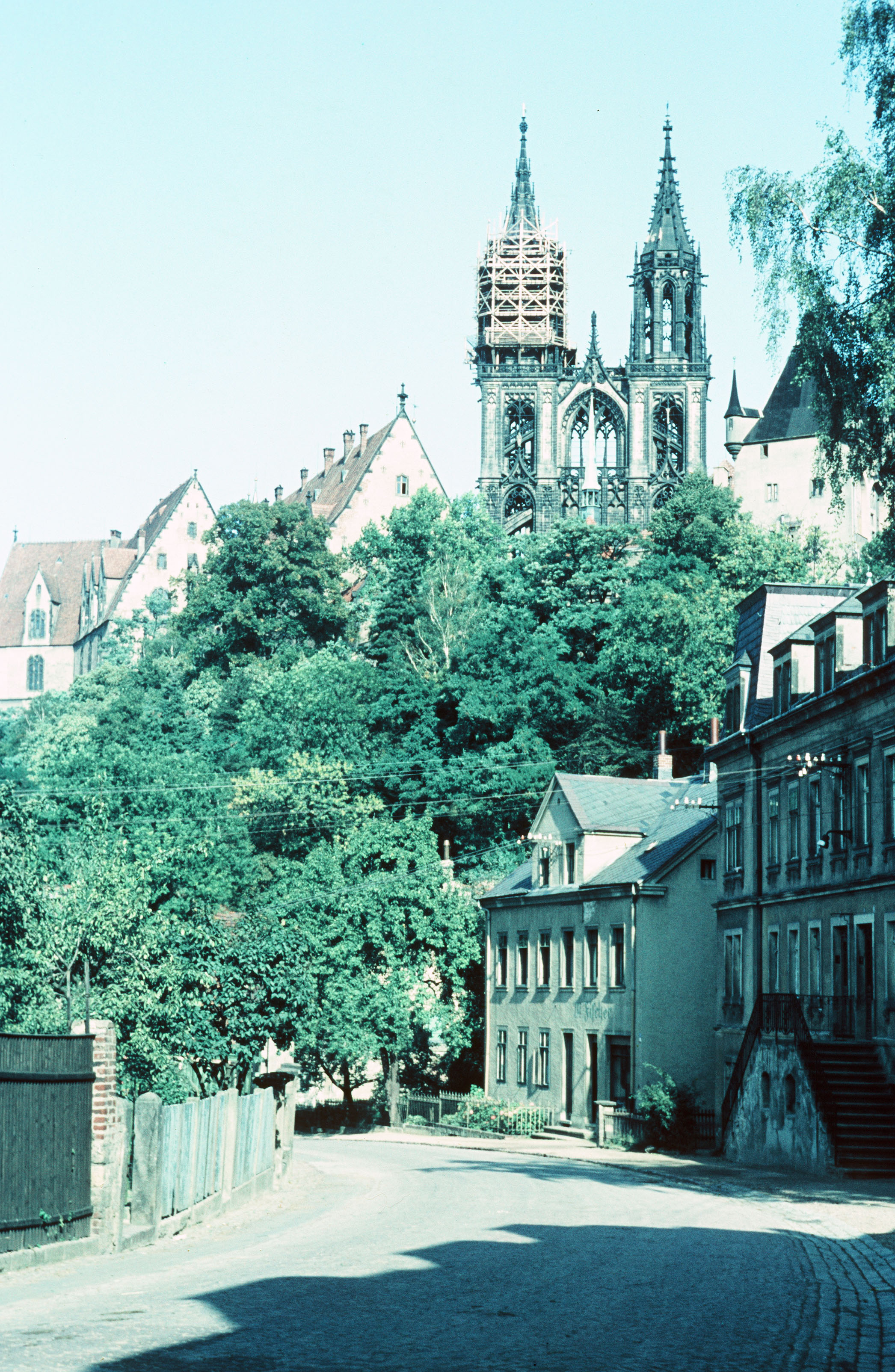 Straßenzug in Meißen mit Blick auf die Türme des Doms zu Meißen