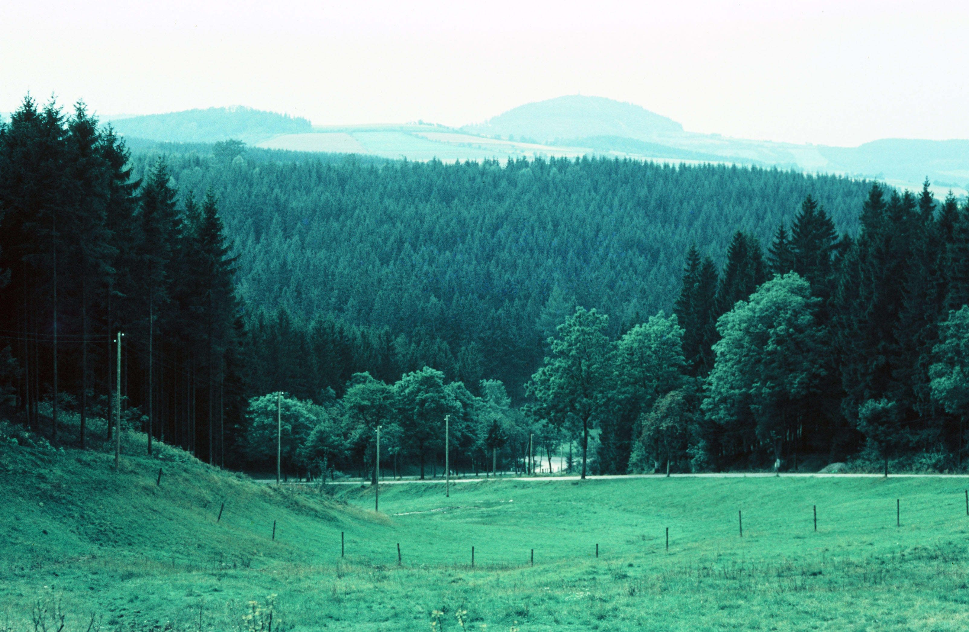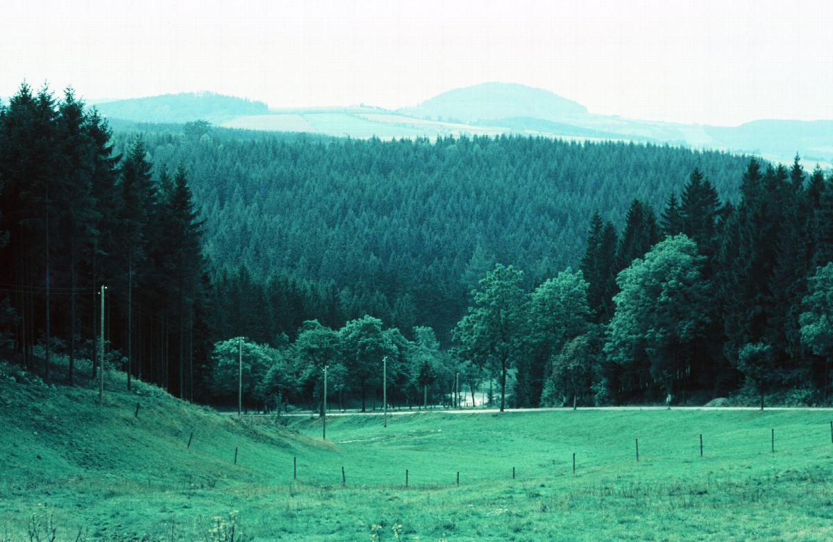 Blick über bergiges Weideland auf Nadelwälder