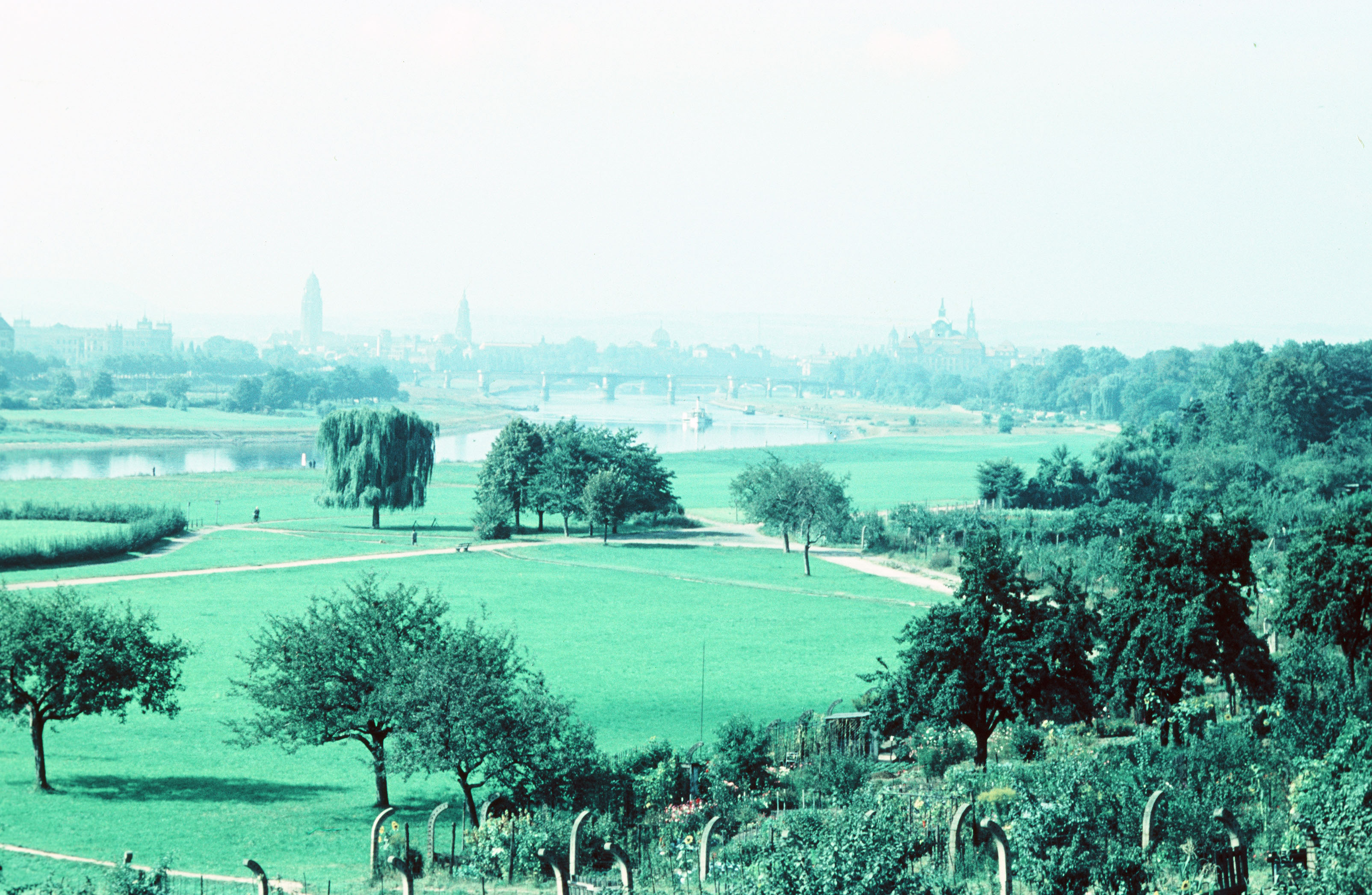 Blick vom Waldschlösschen über Uferpark und Elbe, Dresden