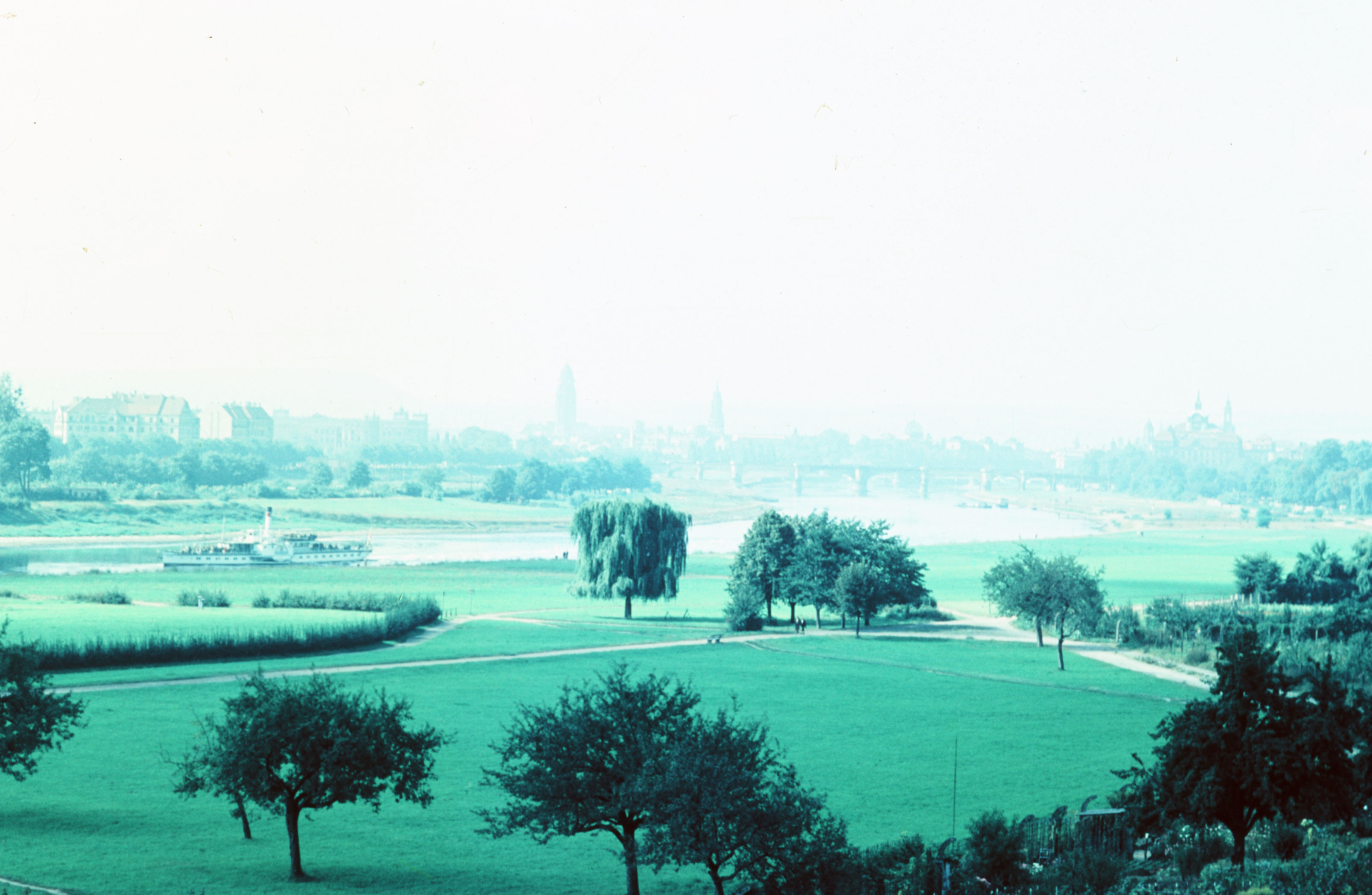 Blick vom Waldschlösschen über Uferpark und Elbe, Dresden