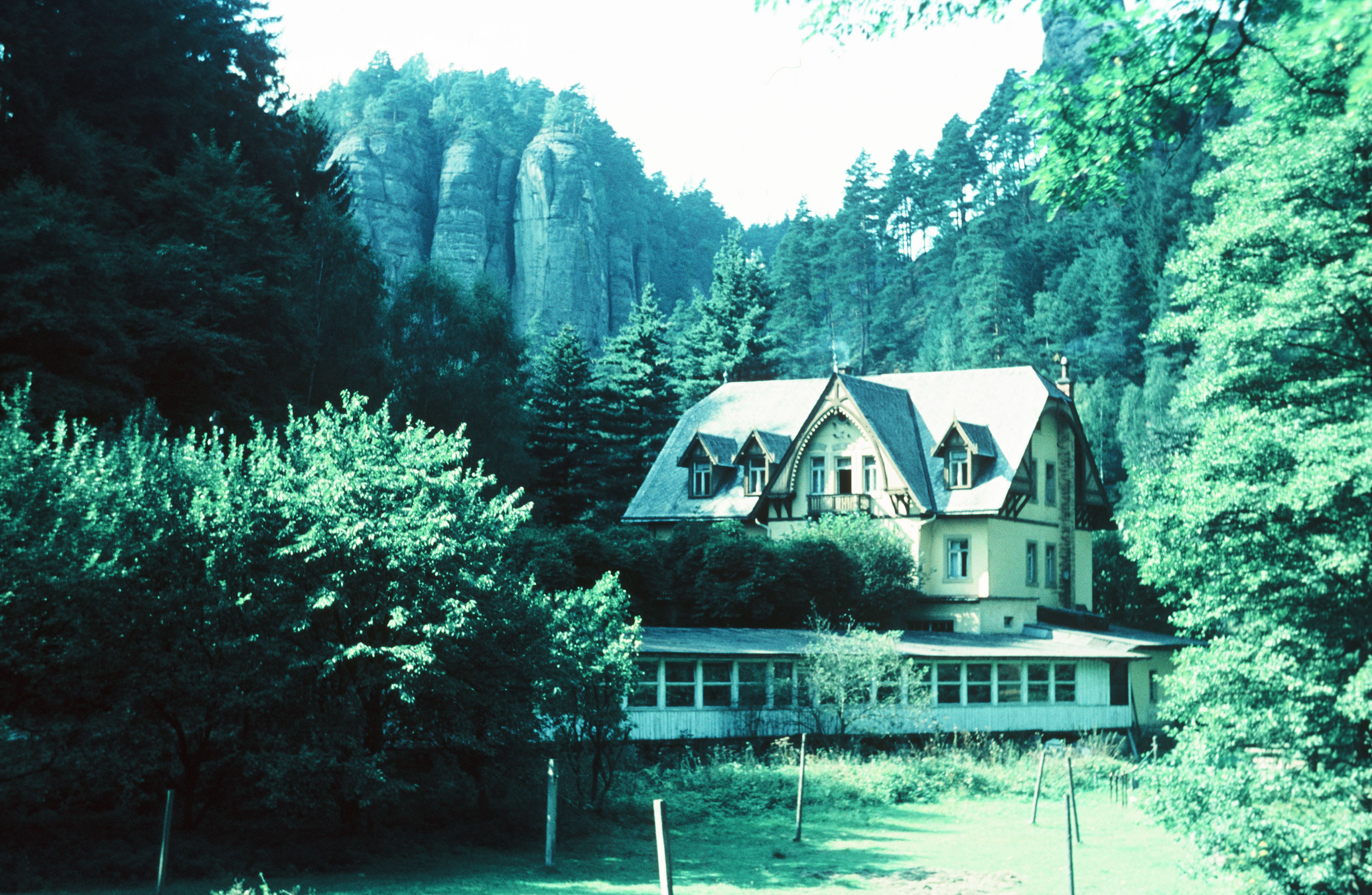 Blick auf Waltersdorfer Mühle vor Sandsteinfelsen, umgeben von Wald
