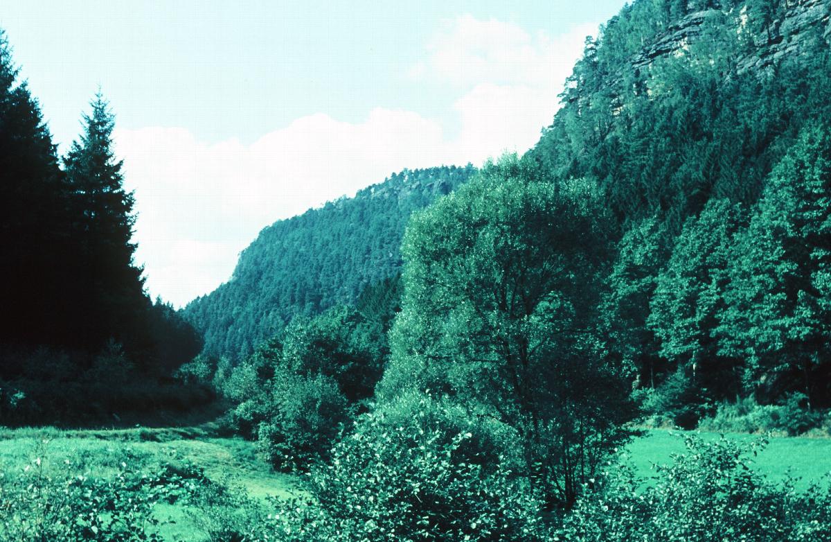 Blick vom Polenztal auf die bewaldeten Sandsteinberge