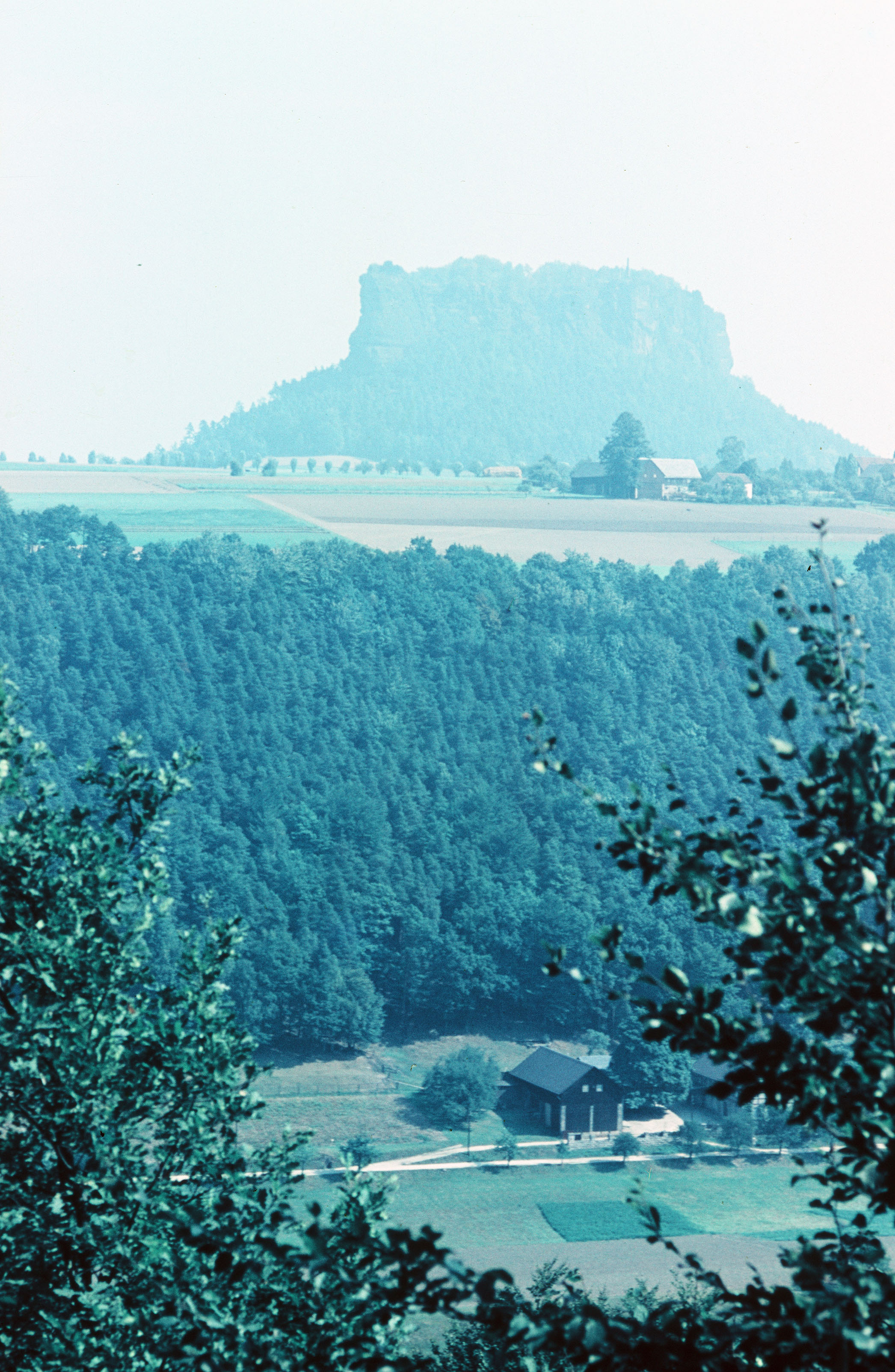 Ausicht über Wald und Felder auf Berg Lilienstein. Das Haus unten ist der Kastanienhof in Halbestadt.