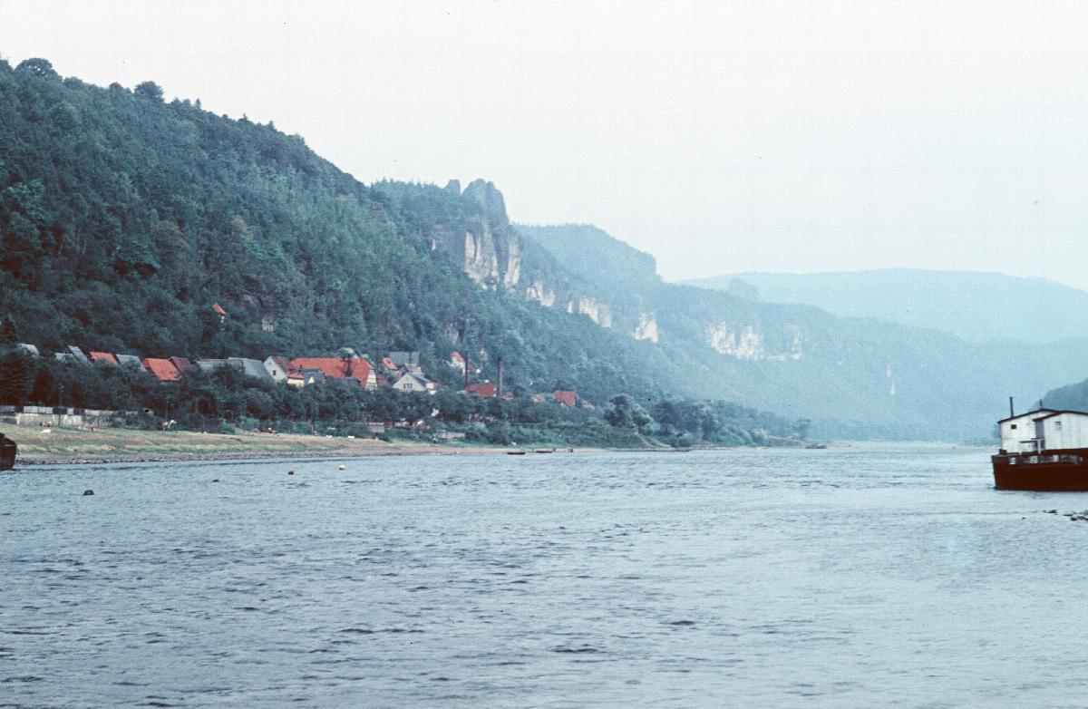 Blick über die Elbe auf Postelwitz, bewaldetes Sandsteingebirge