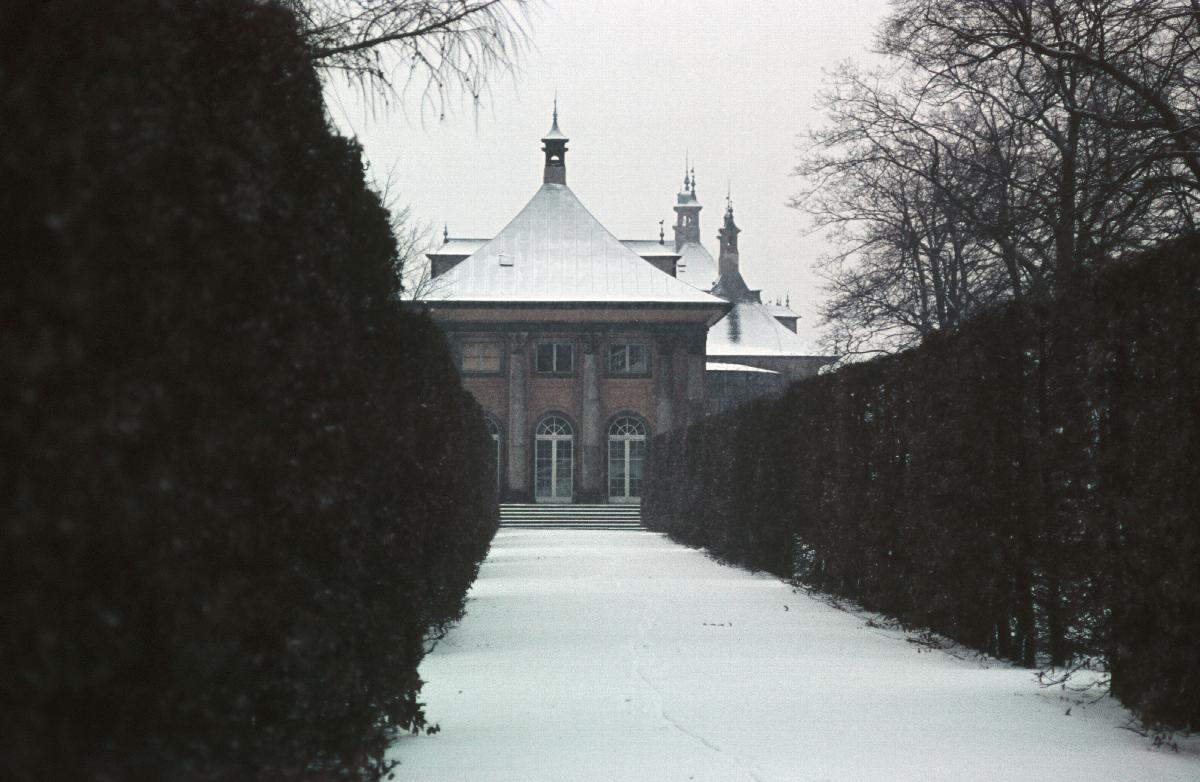 Verschneiter Schlosspark Pillnitz mit Blick auf ein Schlossgebäude