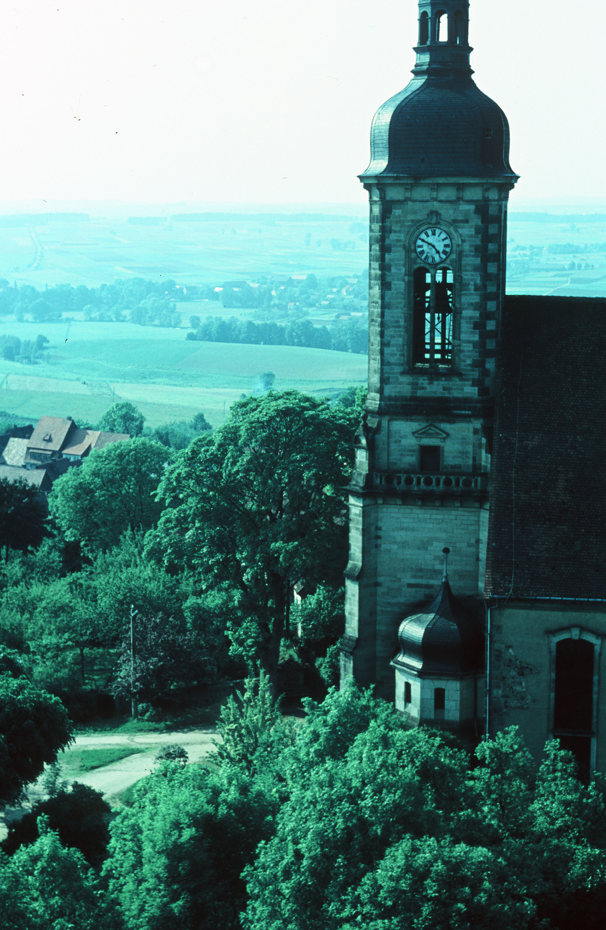 Blick auf die Stadtkirche Stolpen, Hintergrund: Felder