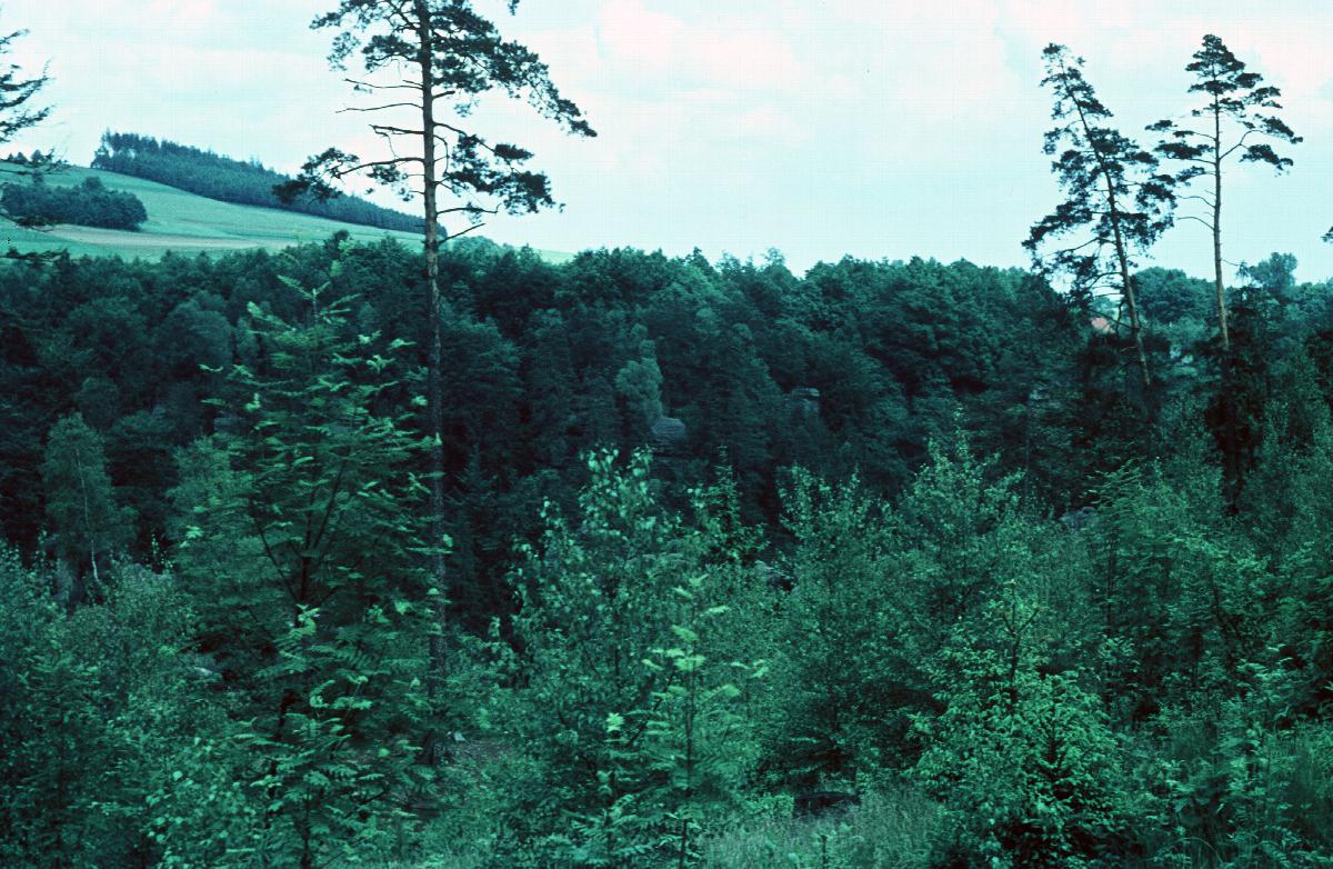 Blick über bewaldetes Sandsteingebirge bei Zinnwald, Hintergrund: Felder