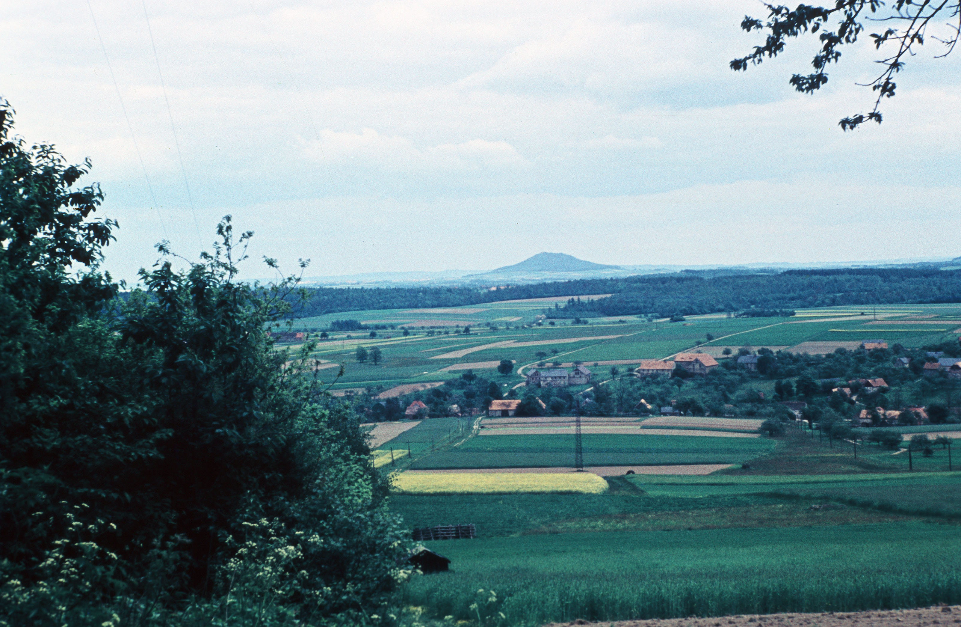 Blick vom Rotstein über Sohland am Rotstein, Felder, Wald und auf die Landeskrone